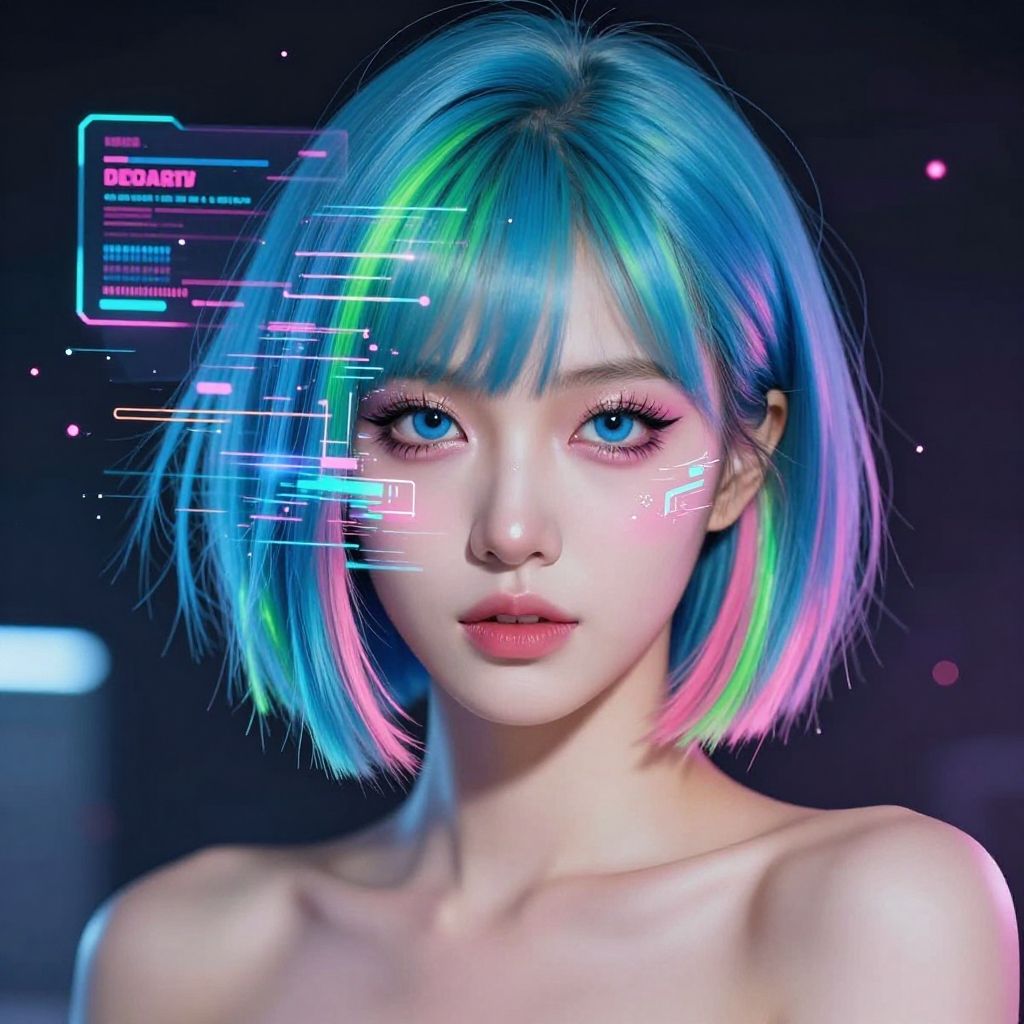 1girl, solo, lucy \(cyberpunk\), cyberpunk \(series\), asymmetrical hair, short hair, blue hair, green hair, pink hair, multicolored hair, blue eyes, eyeliner, eyeshadow, makeup, bare shoulders, portrait, looking at viewer, cyberpunk, hlpr, futuristic, hologram, glitch, holographic face, ui, interface, nodes, particles, depth of field, bokeh, masterpiece, best quality, very aesthetic, absurdres