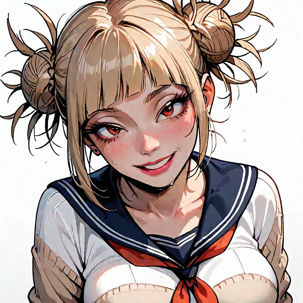 Score_9, score_8_up, score_7_up, score_6_up, score_5_up, score_4_up, himiko toga from my hero academia standing looking at viewer, massive round breasts, seductive smile, half closed eyes, sweaty