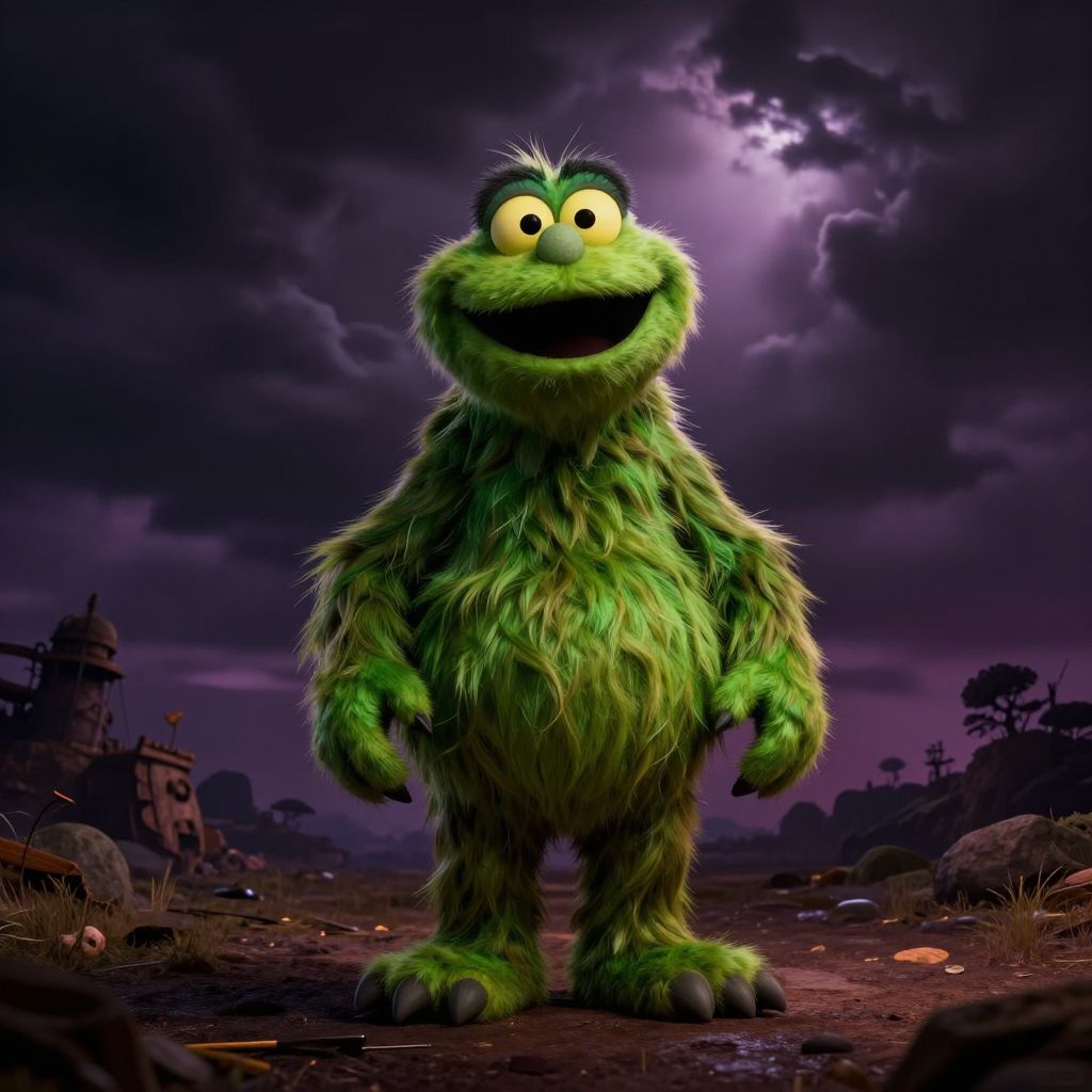 Is Grimace dangerous? - a surreal cartoon landscape where Grimace from McDonald's looms ominously, dark clouds and eerie shadows, atmospheric lighting, vivid colors