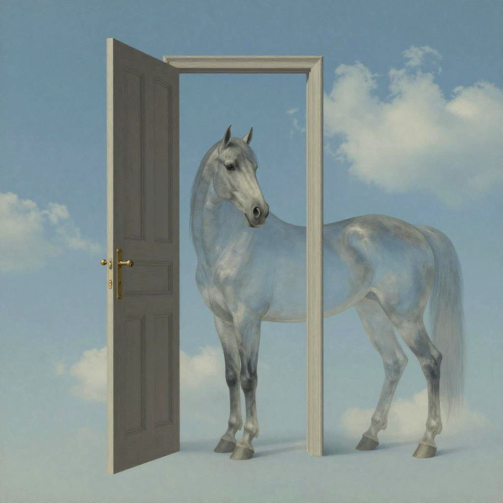 Rene Magritte horse with door frames hanging from its body, blue sky with scattered clouds, surreal concept art, horse partially transparent, enigmatic and whimsical mood