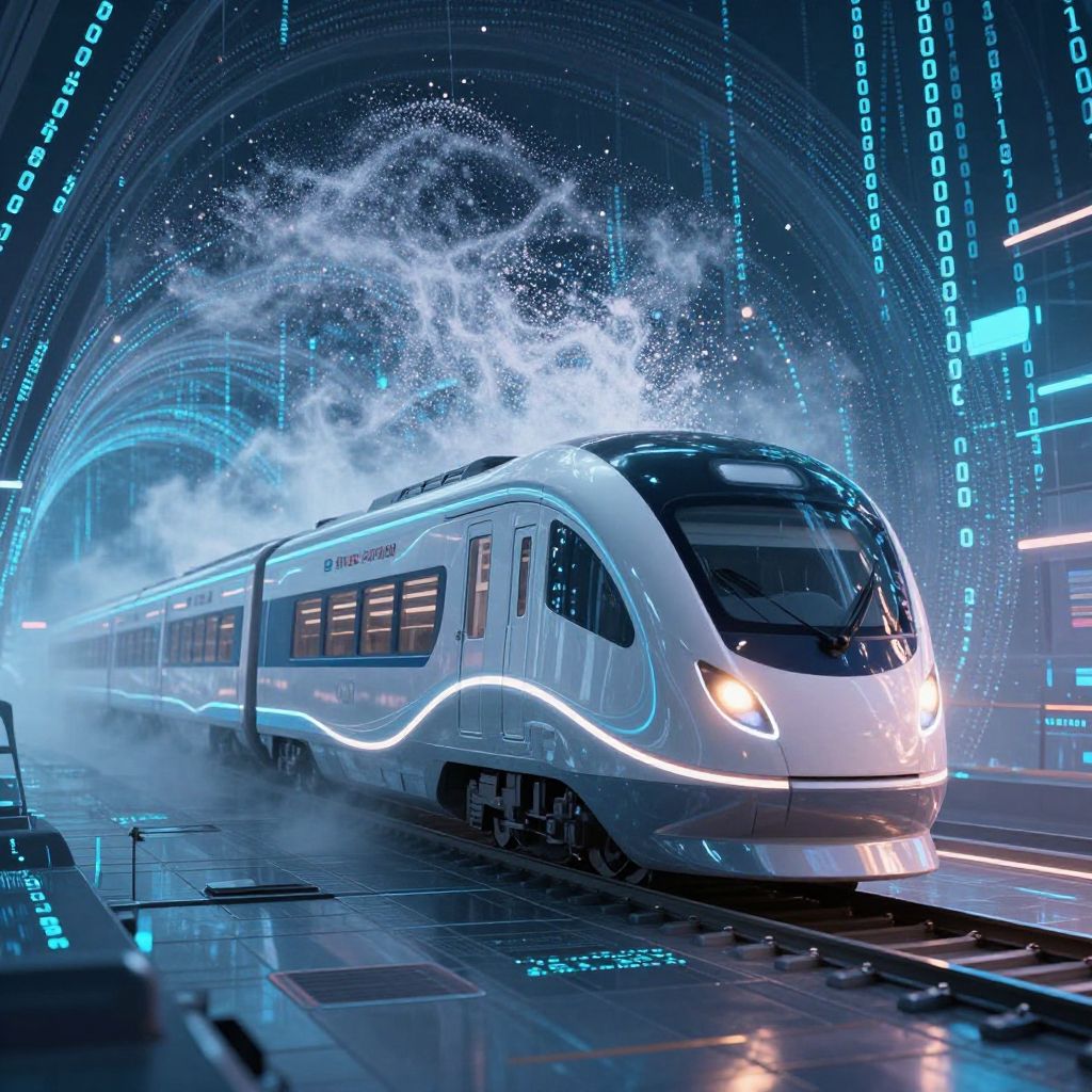 Stable diffusion train model visualized as a powerful AI-driven train, surrounded by swirling mist of particles symbolizing data diffusion, futuristic design with smooth aerodynamic curves, passing through a digital tunnel made of pulsing binary numbers, vivid and immersive.