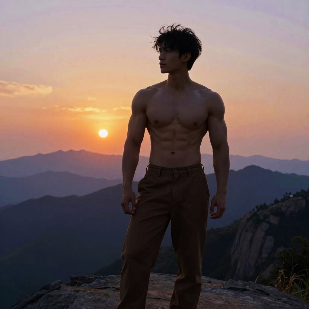 Photograph of a muscular, shirtless Asian man with tousled black hair, standing confidently on a rocky mountain ledge during sunset. He's wearing brown pants, and the sun is setting behind him, casting a warm orange glow over the mountain range in the background. The man's defined abs and strong arms are prominently featured, and the sky transitions from orange to purple hues.
