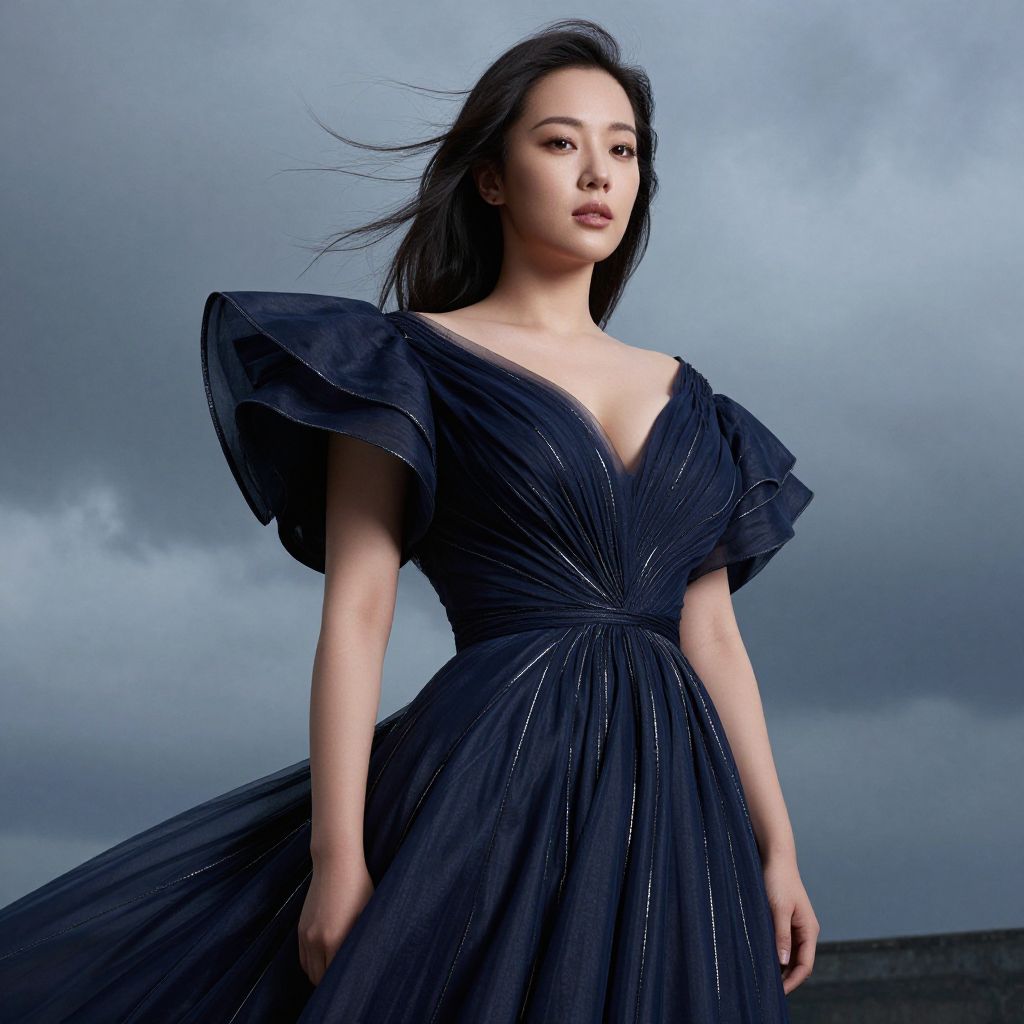 A strong, elegant woman with defined facial features and a thoughtful yet powerful expression dons an extravagant shoulder gown with dramatic power silhouette lines, flowing in a moody, stormy environment beneath a cloudy sky, the gown in deep navy and charcoal with silver thread detailing, capturing the movement of wind, realistic cinematic photograph. The woman has big tits and cute face