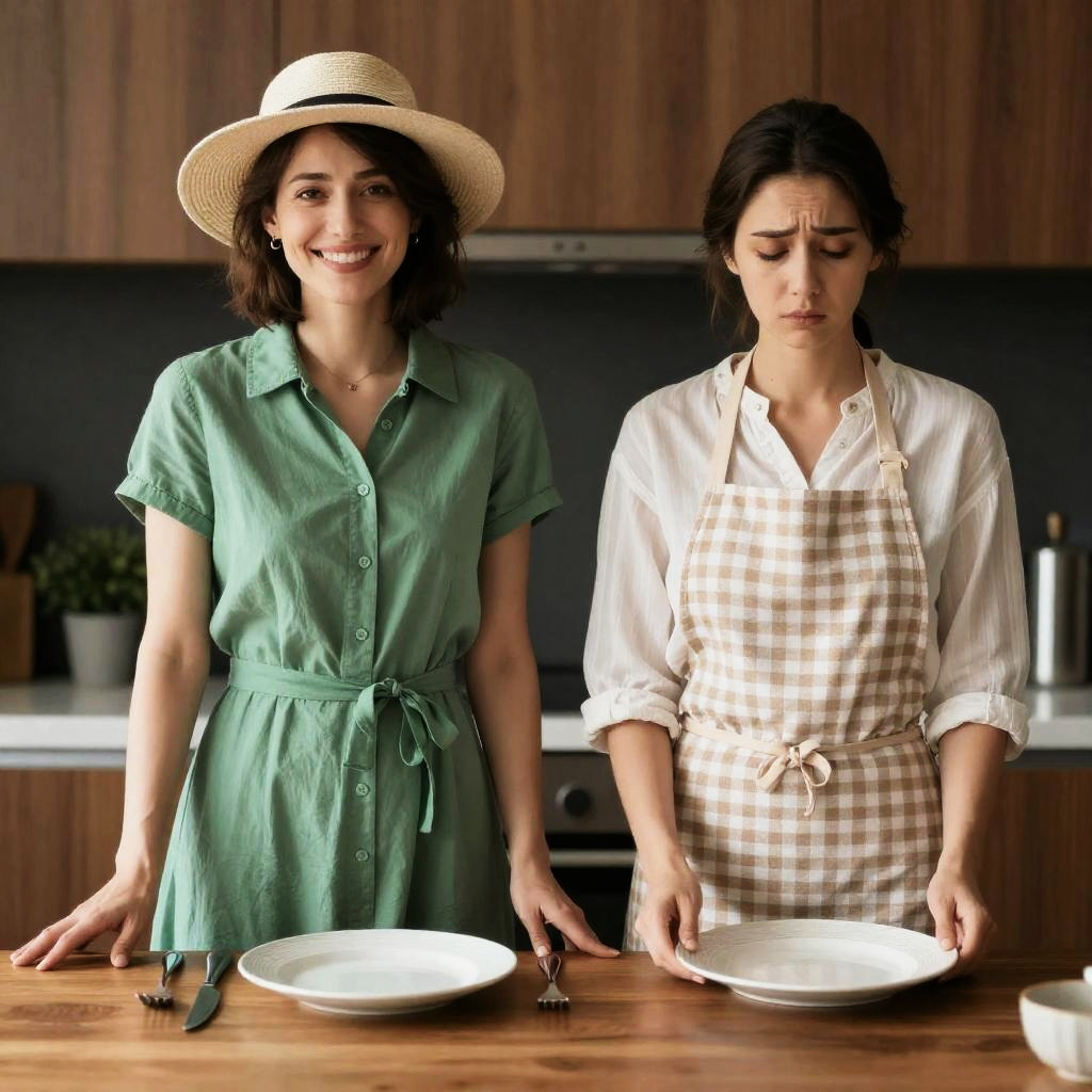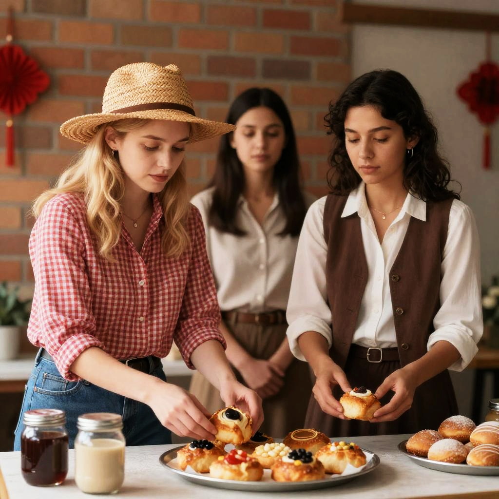 Photograph of three people in a rustic setting. Two women with blonde hair, one in a red checkered shirt and straw hat, the other in a brown vest, serve food. A dark-haired woman stands behind them. Table with jars and tray of pastries in front. Brick wall and red decorations in background. One woman looks down at food, the other at the dark-haired woman, both have neutral expressions.