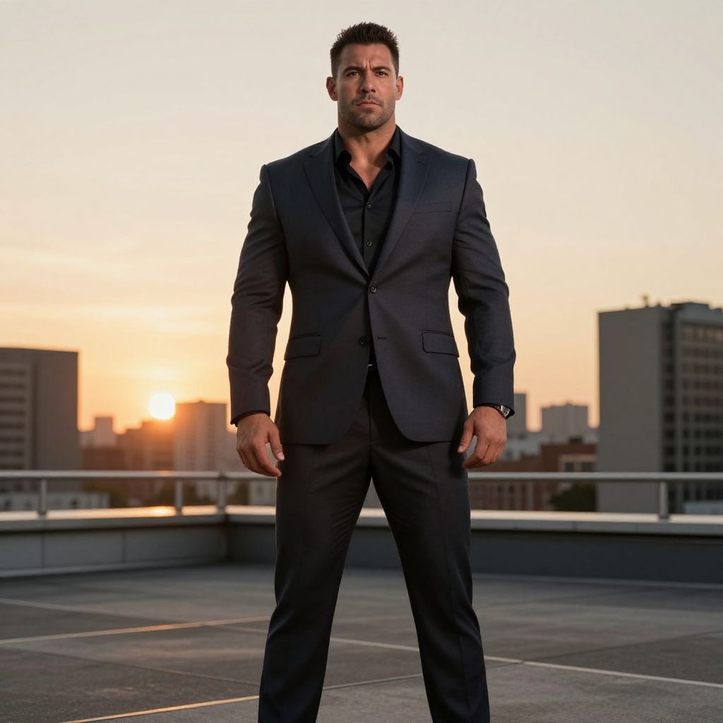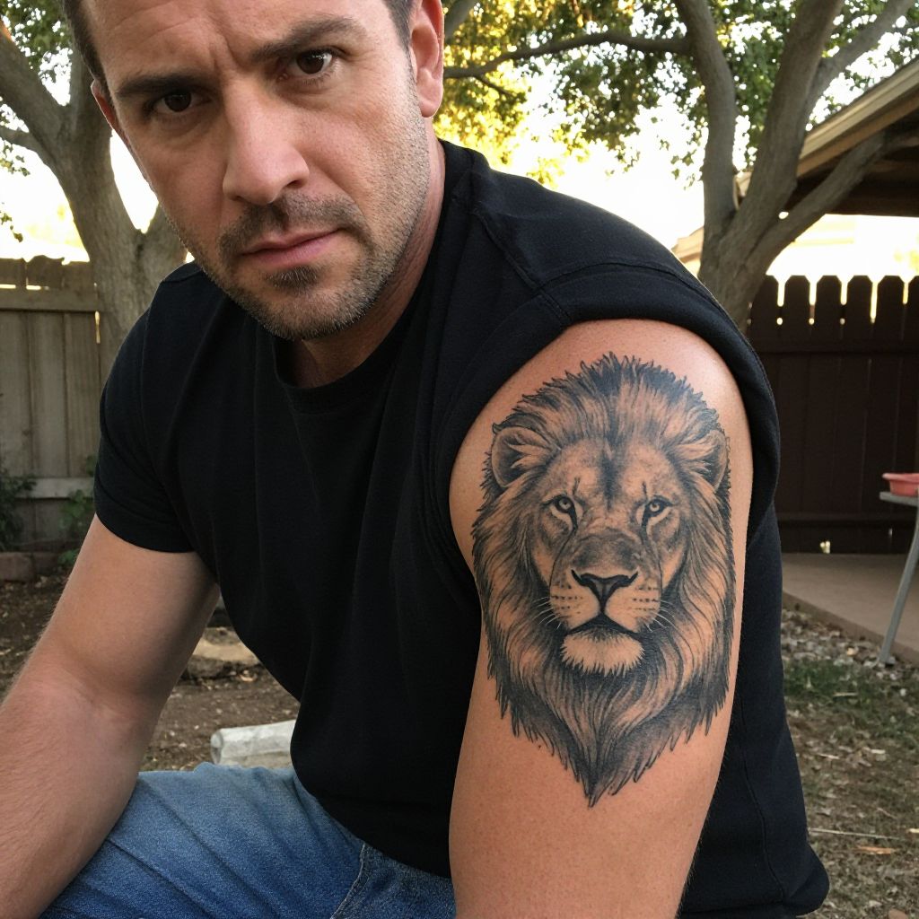 A close-up realistic photograph of a man with a strong, rugged face and deep brown eyes, wearing a black t-shirt and jeans, showing a detailed lion tattoo on his upper right arm, with the lion's mane glowing slightly under natural light, set in a rustic backyard during golden hour with trees and a wooden fence in the background.