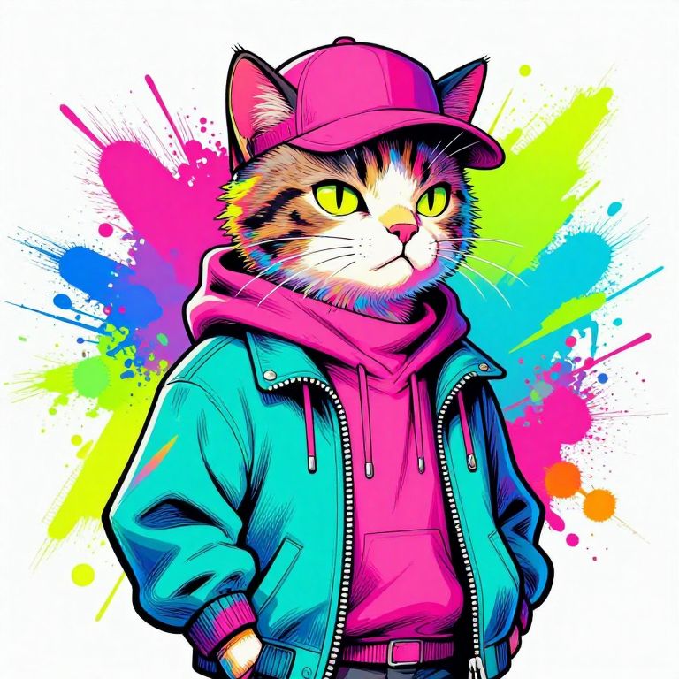 The image features a striking pop art depiction of a cat, rendered in vibrant, neon colors against a stark white background. The cat, with its feline features and human-like posture, is adorned in a stylish outfit that includes a teal jacket, a pink scarf, and a matching pink hat. The jacket is detailed with a zipper and pockets, adding to its urban, streetwear aesthetic. The cat's fur is a mix of white and colorful splashes, reminiscent of watercolor techniques, giving it a dynamic and lively appearance. The background is a burst of neon colors, including shades of pink, blue, green, and yellow, creating a sense of movement and energy. The overall composition is reminiscent of manga art and comic book styles, with bold lines and a sense of depth achieved through inking and shading. The image has a graffiti art feel, with splatters and drips adding to the urban, edgy vibe. The cat's expression is cool and confident, with a slight tilt of its head, exuding a sense of attitude and personality. The image is a perfect blend of pop art, anime, and comic book influences, creating a unique and captivating visual experience.