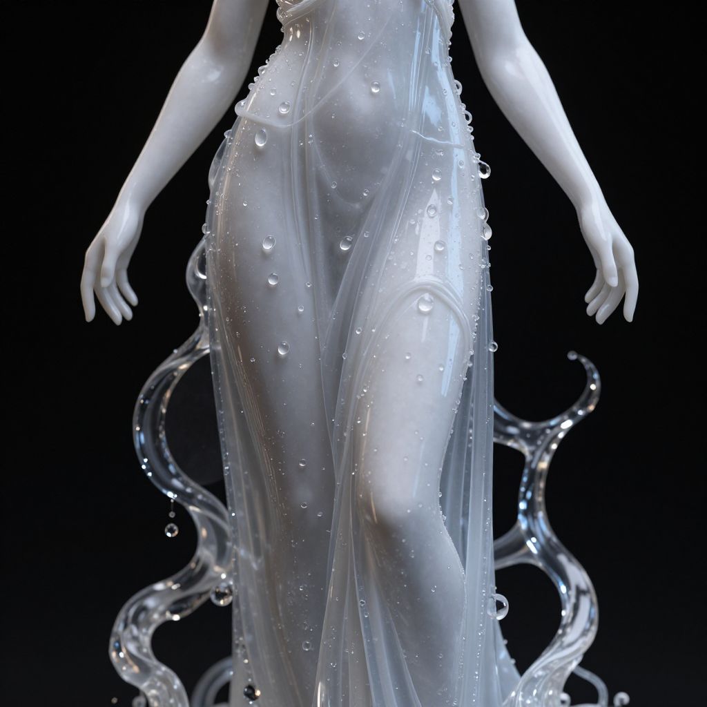 Digital artwork of a white-skinned, female mannequin in a translucent, water-drip-covered dress with swirling, liquid-like textures against a black