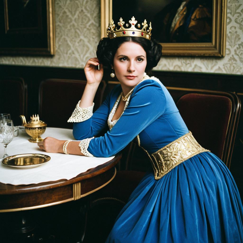British Fancy Dress Woman, woman in a blue dress and a tiable with a gold crown