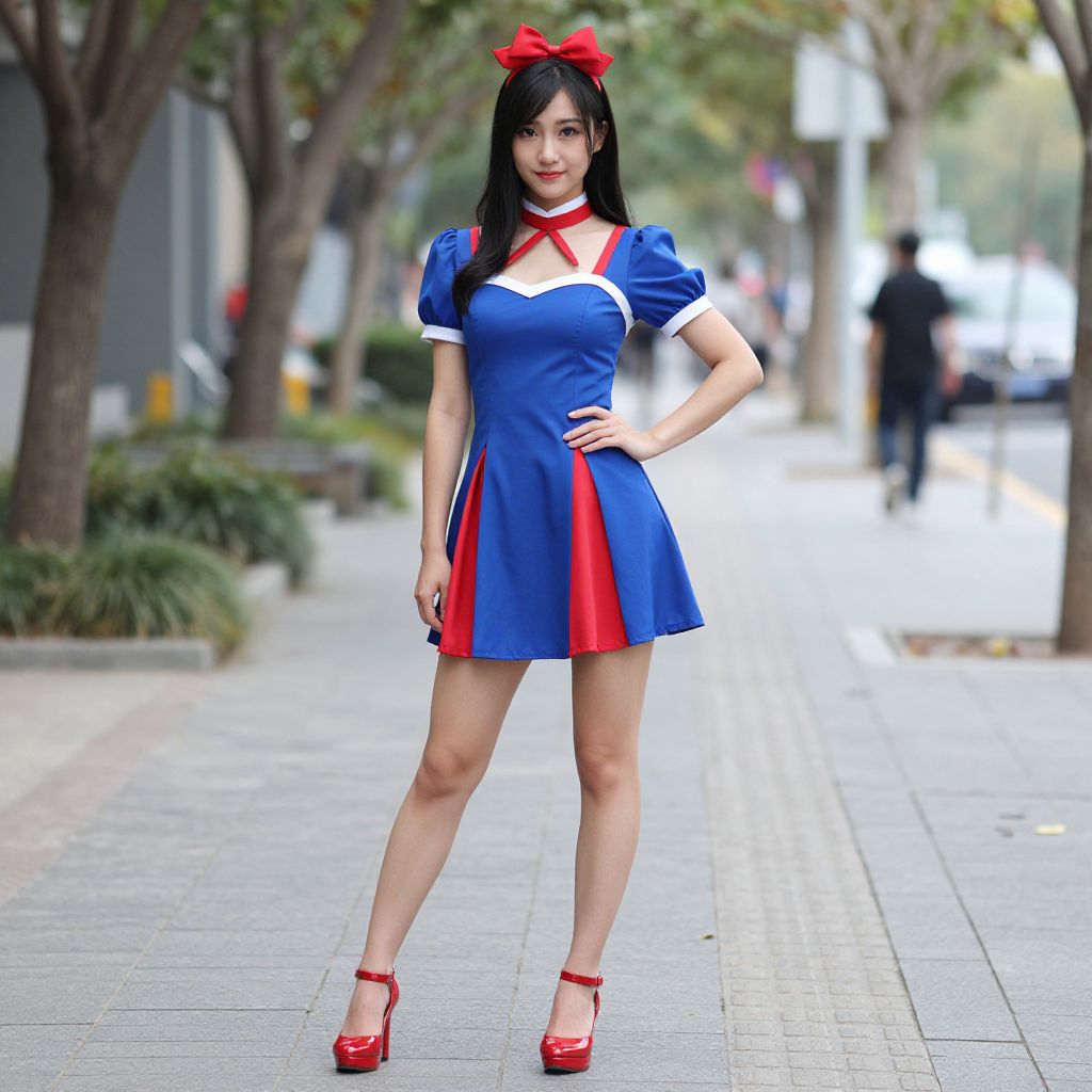 Photograph of an Asian woman with long black hair, wearing a blue and red costume inspired by Disney's Snow White. She has a red bow on her head, puffed short sleeves, a red neckline, and a short skirt with blue and red panels. She stands confidently on a city sidewalk, hands on hips, wearing red platform heels. The background features blurred trees, pedestrians, and buildings. The sidewalk is paved with light gray tiles, and the scene is brightly lit with natural daylight.