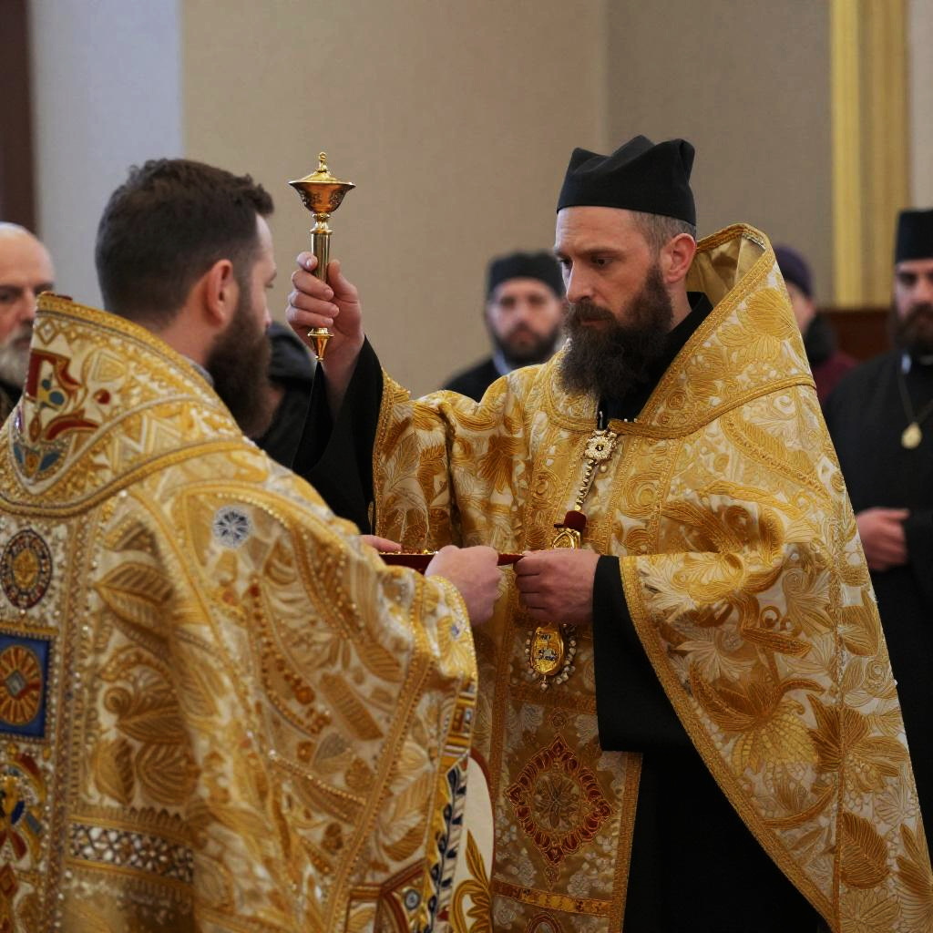 A historical scene showing an Orthodox monk putting on the analavos during a solemn ceremony, detailed fabric patterns visible, warm church lighting emphasizing textures and colors, atmosphere rich with spiritual intensity and heritage
