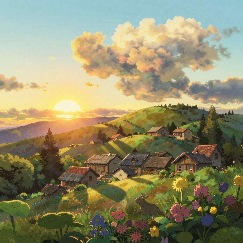 Studio ghibli sunset scene featuring a cozy village atop rolling hills, golden sun casting long shadows, soft clouds glowing in pastel colors, detailed flora and fauna, dreamy and peaceful vibe reminiscent of Hayao Miyazaki's art style, warm and inviting
