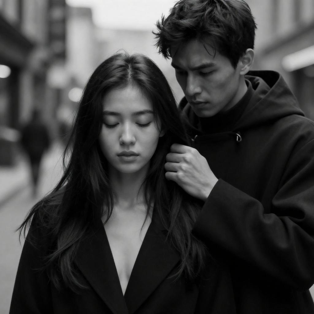 Black and white photograph depicting an intense moment where an Asian man with slicked-back hair and a focused expression grips the long hair of a Caucasian woman with closed eyes. The woman wears a buttoned shirt, and the background features a dimly lit room with candlelight and blurred figures, creating a dramatic and moody atmosphere.