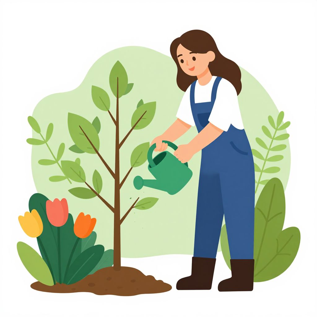 Illustration of a woman with brown hair, wearing blue overalls and white shirt, watering a small plant with green leaves and red-orange tulips,