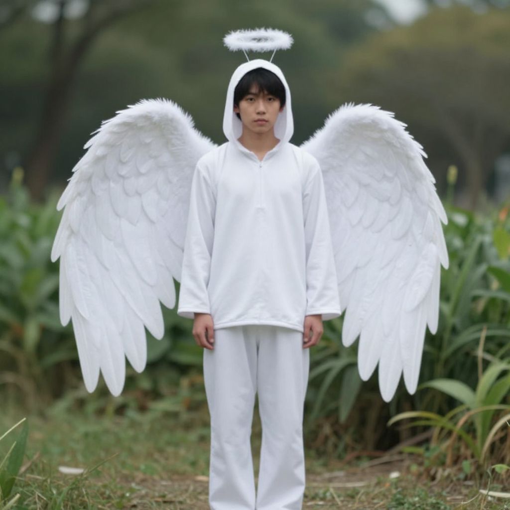 Angel fish costume, wings, halo, 1boy, solo, male focus, angel, plant, outdoors, full body, standing, hood, blurry
