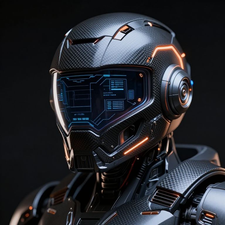 Close-up of futuristic sci fi power armor helmet with transparent visor showing a digital HUD, sleek carbon-fiber material with glowing orange energy veins, cybernetic enhancements visible on neck and shoulders, dark background with soft light reflections