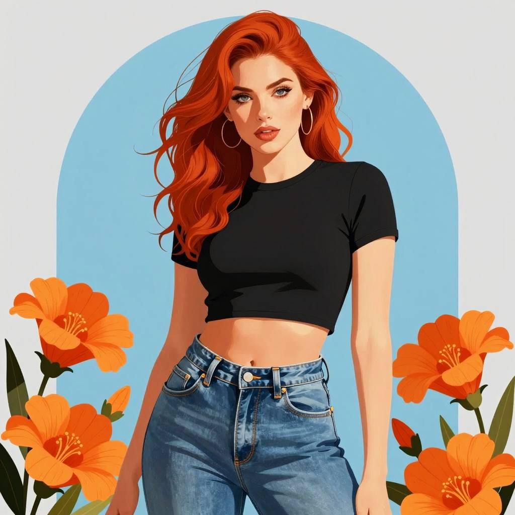 Digital illustration of a confident young woman with long red hair wearing a black crop top and high-waisted blue jeans. She is framed by blooming orange flowers on both sides against a soft blue and grey arch background. The image blends realistic facial features with stylized comic art techniques.