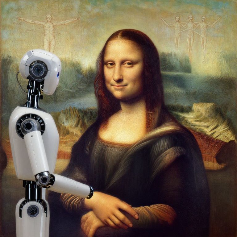 Digital artwork of the Mona Lisa with a white robotic arm, blending Renaissance style with modern technology, featuring three flying figures in the background.
