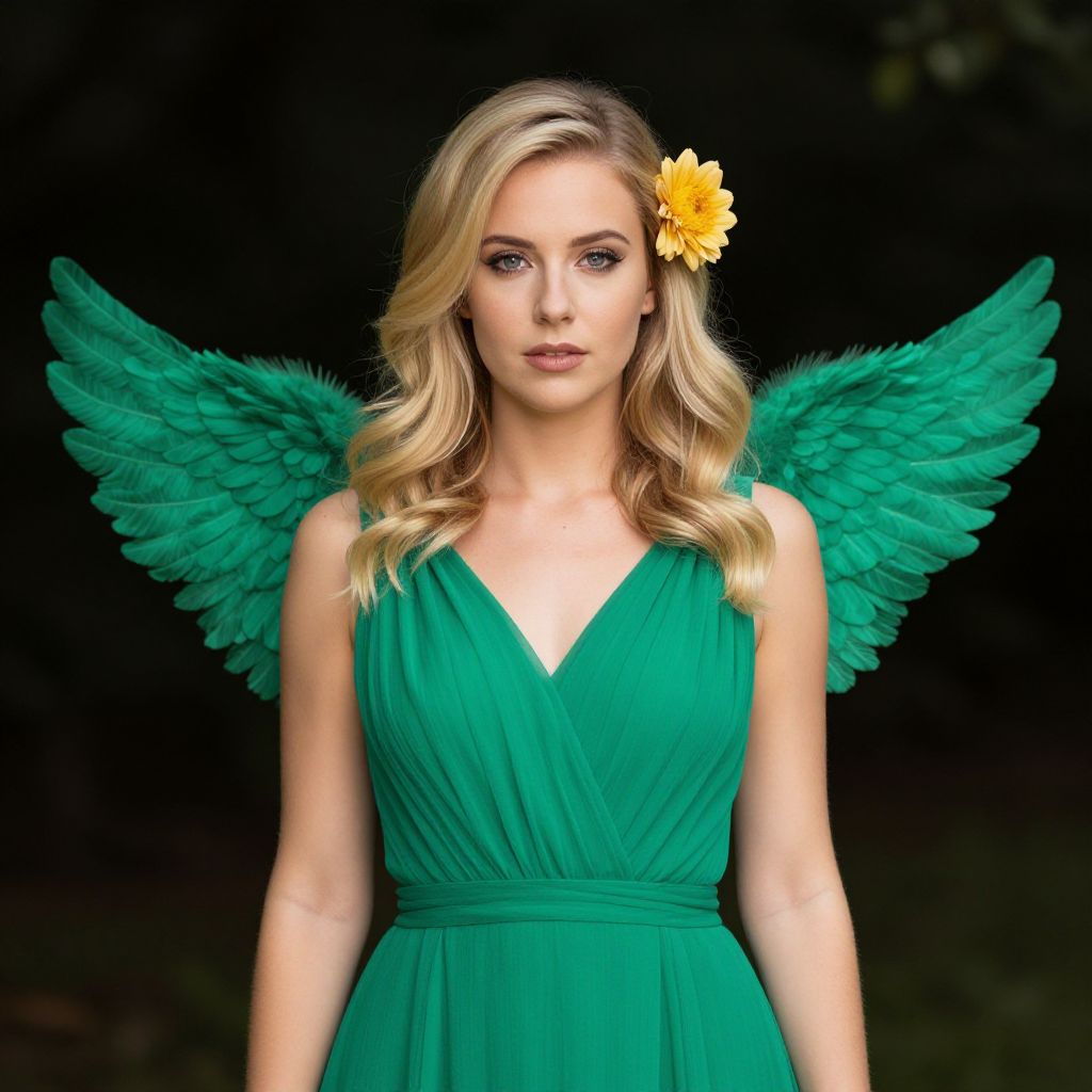 Photograph of a blonde woman with long, wavy hair, wearing a green, V-neck, sleeveless dress with a cinched waist. She has large, green, feathered angel wings on her back and a white flower in her hair. Her makeup is subtle, emphasizing her blue eyes. The background is a plain gray, making her the focal point. The image has a soft, fantasy-like style with a slight digital enhancement, giving it a magical and ethereal feel. The woman's expression is calm and slightly serious.
