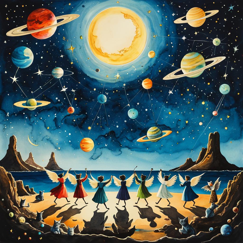 Watercolor Painting in playful primitive surrealist Salvador Dalí style, a fleet of playful celestial beings dancing amidst vibrant planets, above Canary Islands, whimsical, dreamy atmosphere, soft glowing lights, enchanting night sky, infused with magic and love, angels, winged cats
