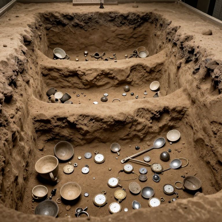 Archaeologists dig through layers of time, unearthing prehistoric teacups, medieval pocket watches, and future spoons intermixed in one time-defective trench.