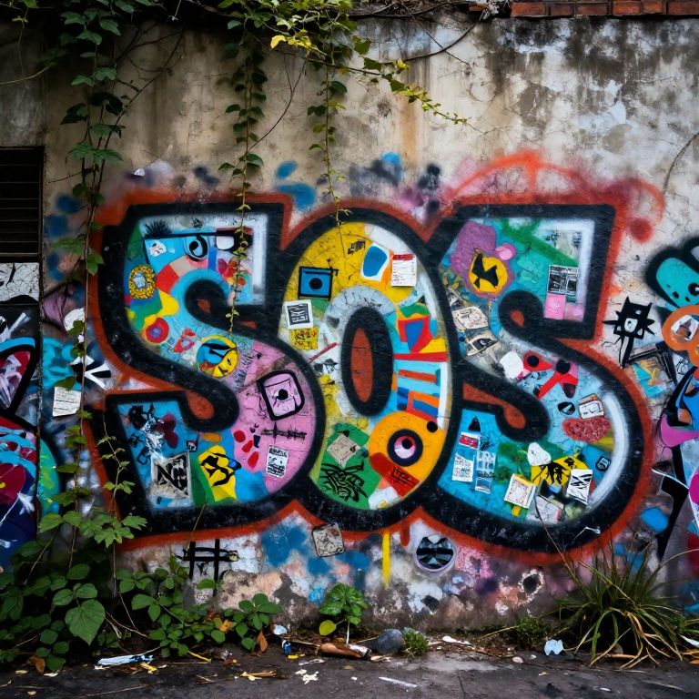 Sos painted on a cracked wall in an urban graffiti style, vibrant colors with mixed media textures, surrounded by overgrown vines and urban decay elements, moody street art scene with a focus on raw emotion and contrast
