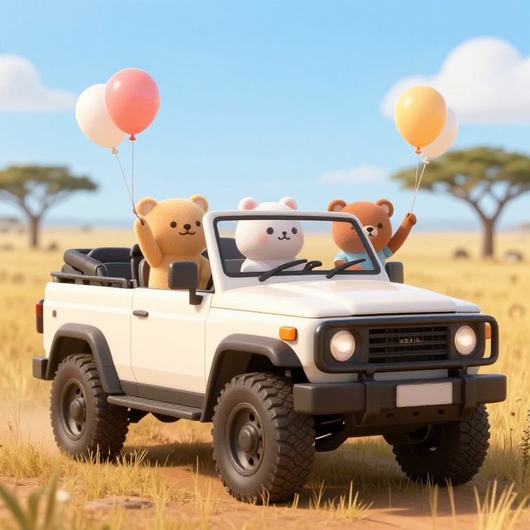 Location Shoot a convertible off-road vehicle in the savannah with three cute people on board throwing balloons, ultra-detailed, cartoon,