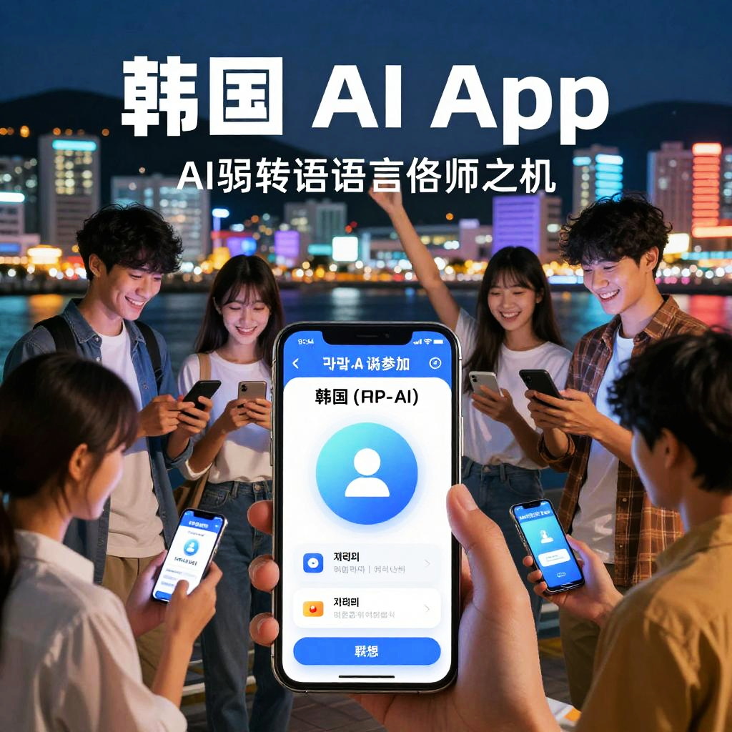 Korean AI app advertisement image showing a diverse group of people using AI-driven language learning tools on phones, vibrant city backdrop of Busan at night, immersive digital overlays illustrating AI assistance, energetic and optimistic mood, high contrast and vivid colors.