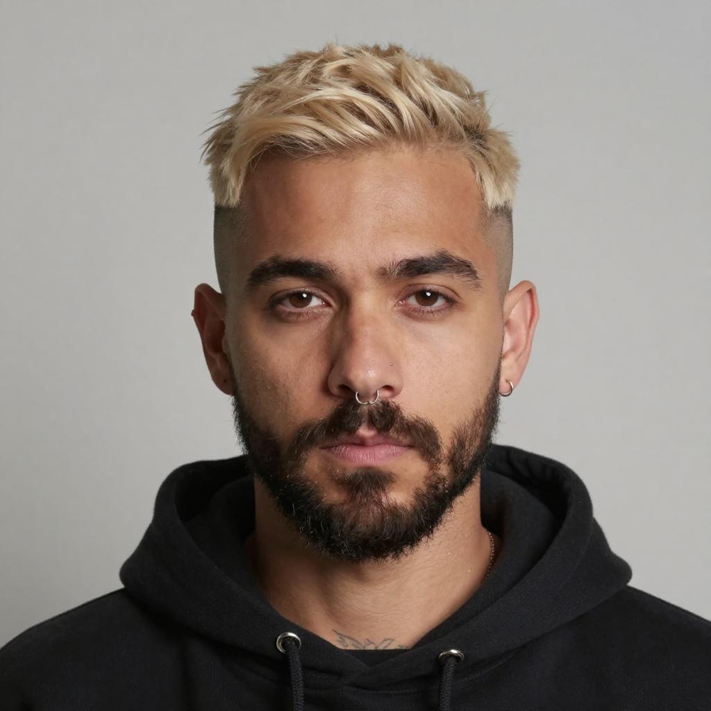 Photograph of a serious-looking man with light brown skin, close-cropped blonde hair with a fade, and a neatly trimmed beard. He has a small nose ring in his left nostril and a subtle tattoo on his neck. His brown eyes are slightly downcast, and he's wearing a black hoodie. The background is a plain, light gray wall. The lighting is soft, highlighting his facial features.