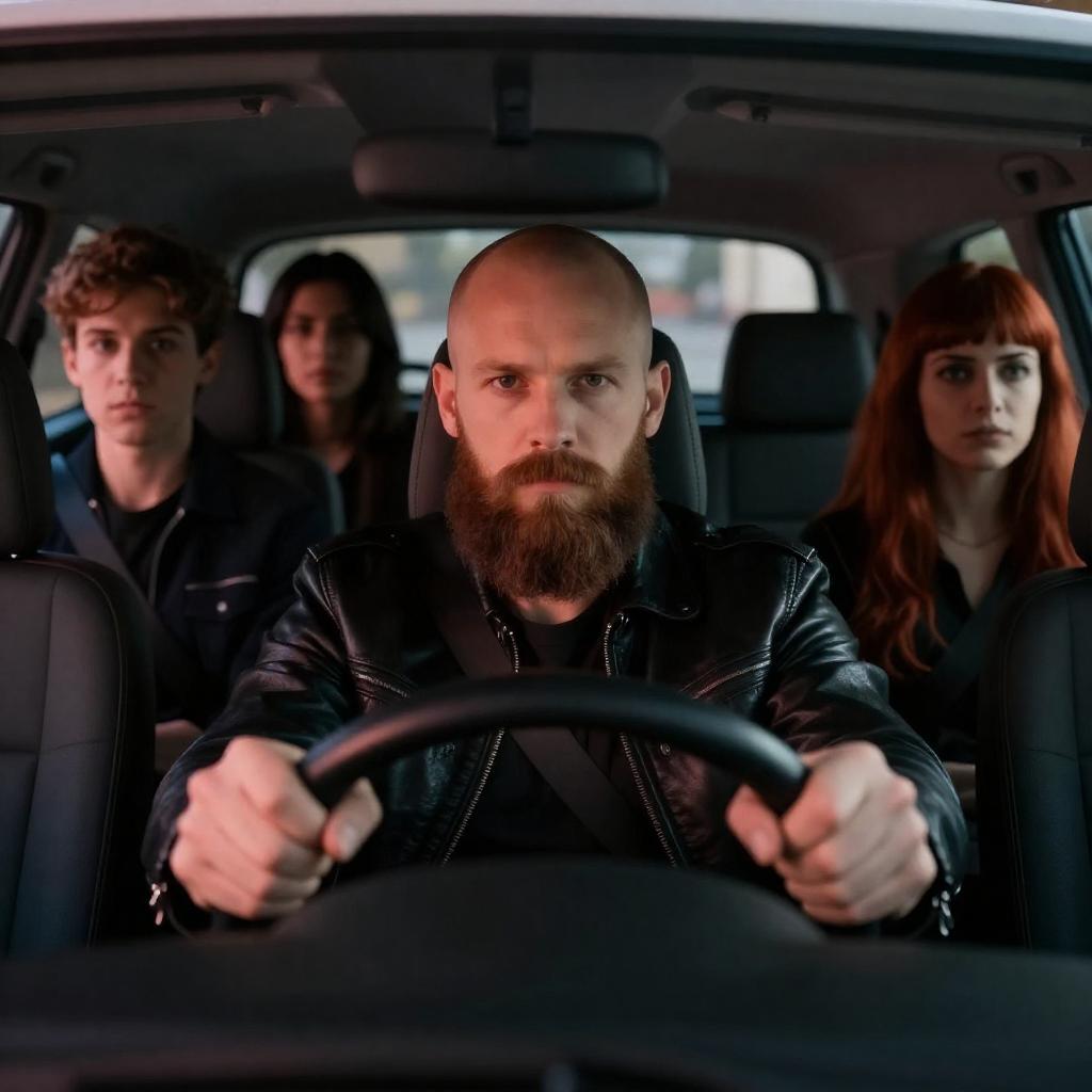 Photograph of a bearded man with a shaved head driving a car, gripping the steering wheel with both hands. Three passengers, a young man with short hair, a woman with dark hair, and another woman with red hair and bangs, sit in the backseat. The man wears a black leather jacket, the young man wears a dark jacket, and the women wear dark clothing. The car's interior is dimly lit with red and blue lighting.