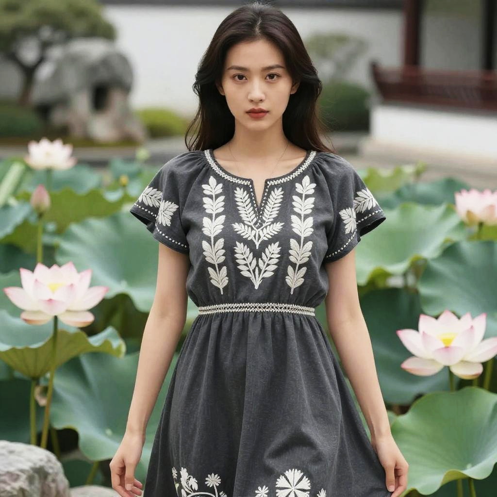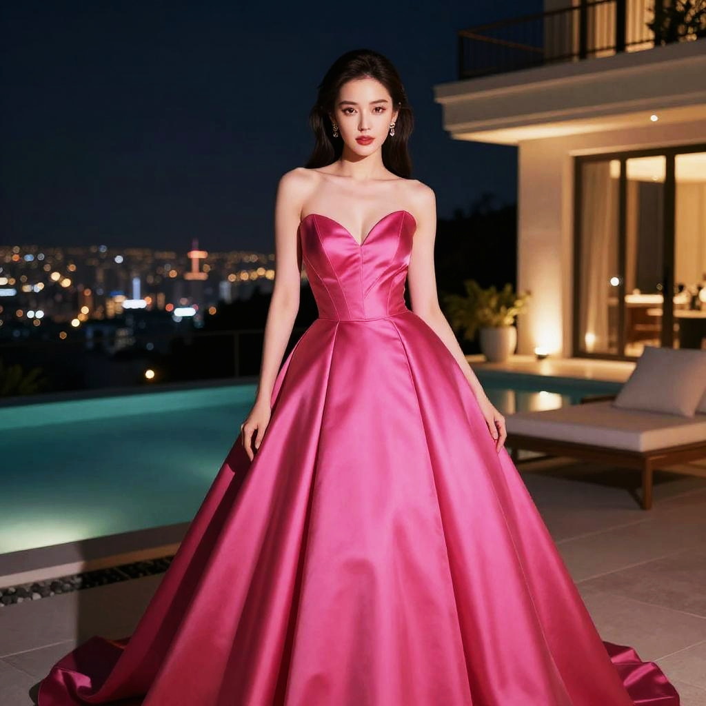 A woman in a shimmering gunmetal grey sleeveless ball gown with a fitted bodice and full pleated skirt, minimalist makeup and jewelry, sleek high updo, set in a tropical garden with a lotus pond, visual style: conclusion. Sexy. Pretty face and beutiful eyes