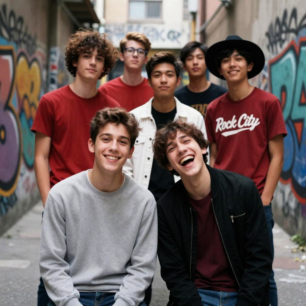 Photograph of six young men in a graffiti-covered alley. Front row: smiling boy in gray sweater, laughing boy in black jacket. Back row: curly-haired boy in red shirt, boy in glasses and red shirt, boy in white jacket, boy in red shirt with "Rock City" , boy in black hat and red shirt. Smiling and intense expressions. Urban, casual attire. Graffiti on gray walls.