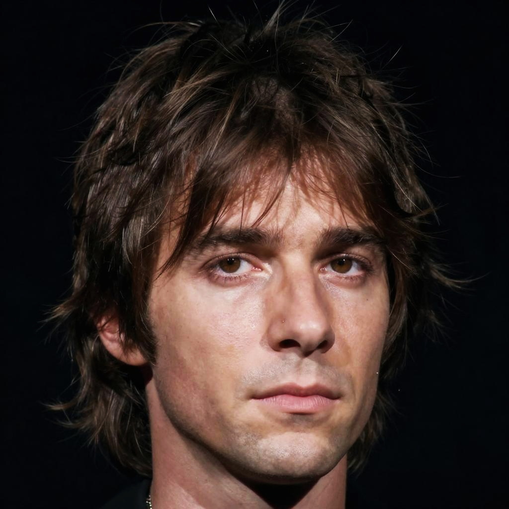 Photorealistic digital portrait of a young man with tousled dark brown hair, light skin, brown eyes, and a serious expression against a black background