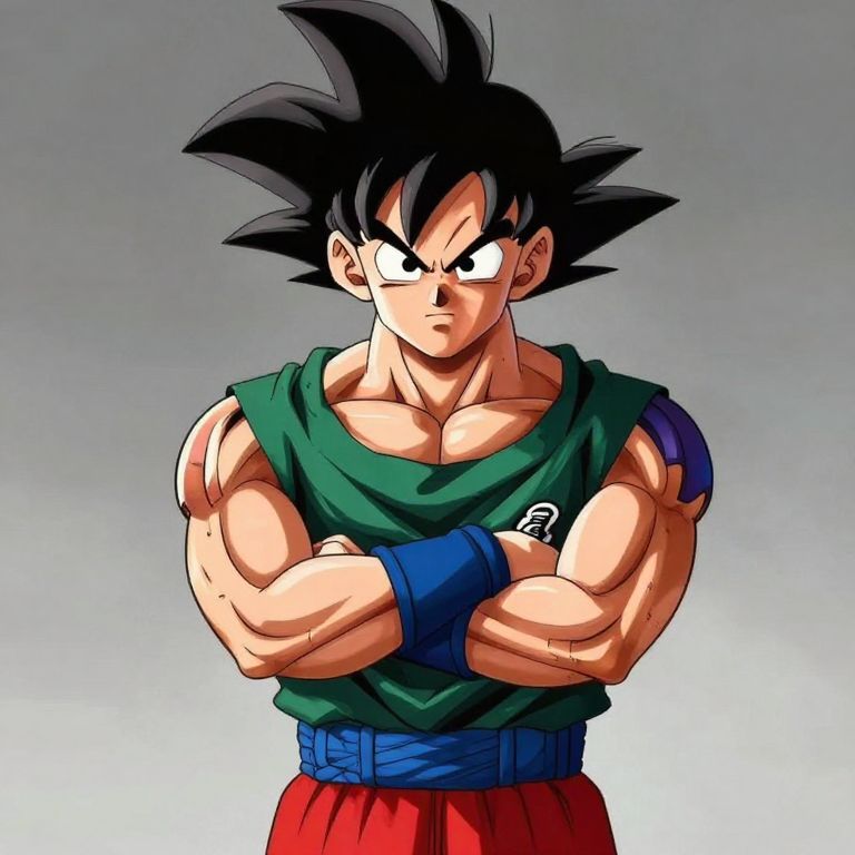 A muscular character with spiky hair and a determined expression, wearing a green tank top and red shorts, stands confidently with arms crossed.