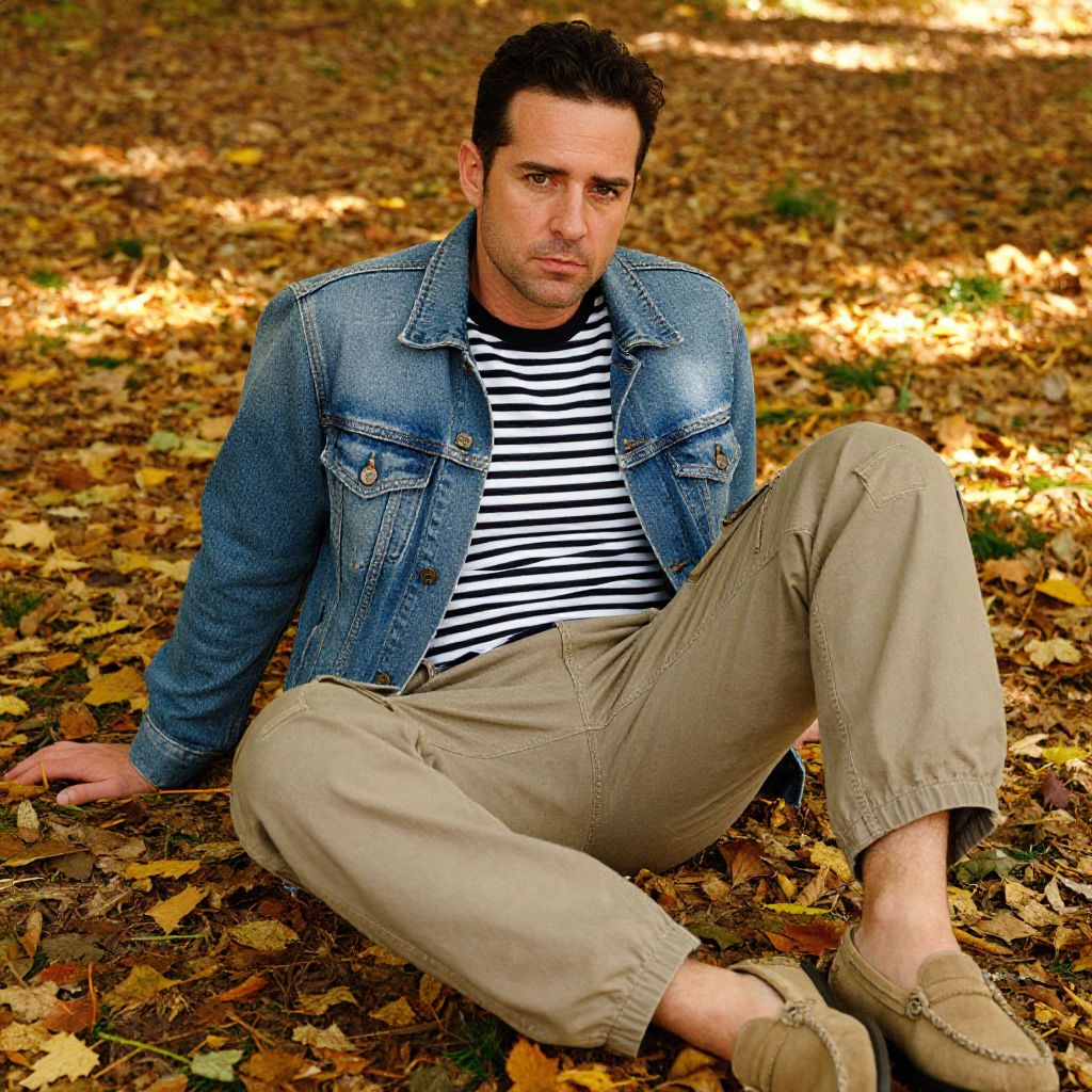 Photograph of a Caucasian man with short dark hair, wearing a denim jacket, striped shirt, beige pants, and brown shoes, sitting on autumn leaves
