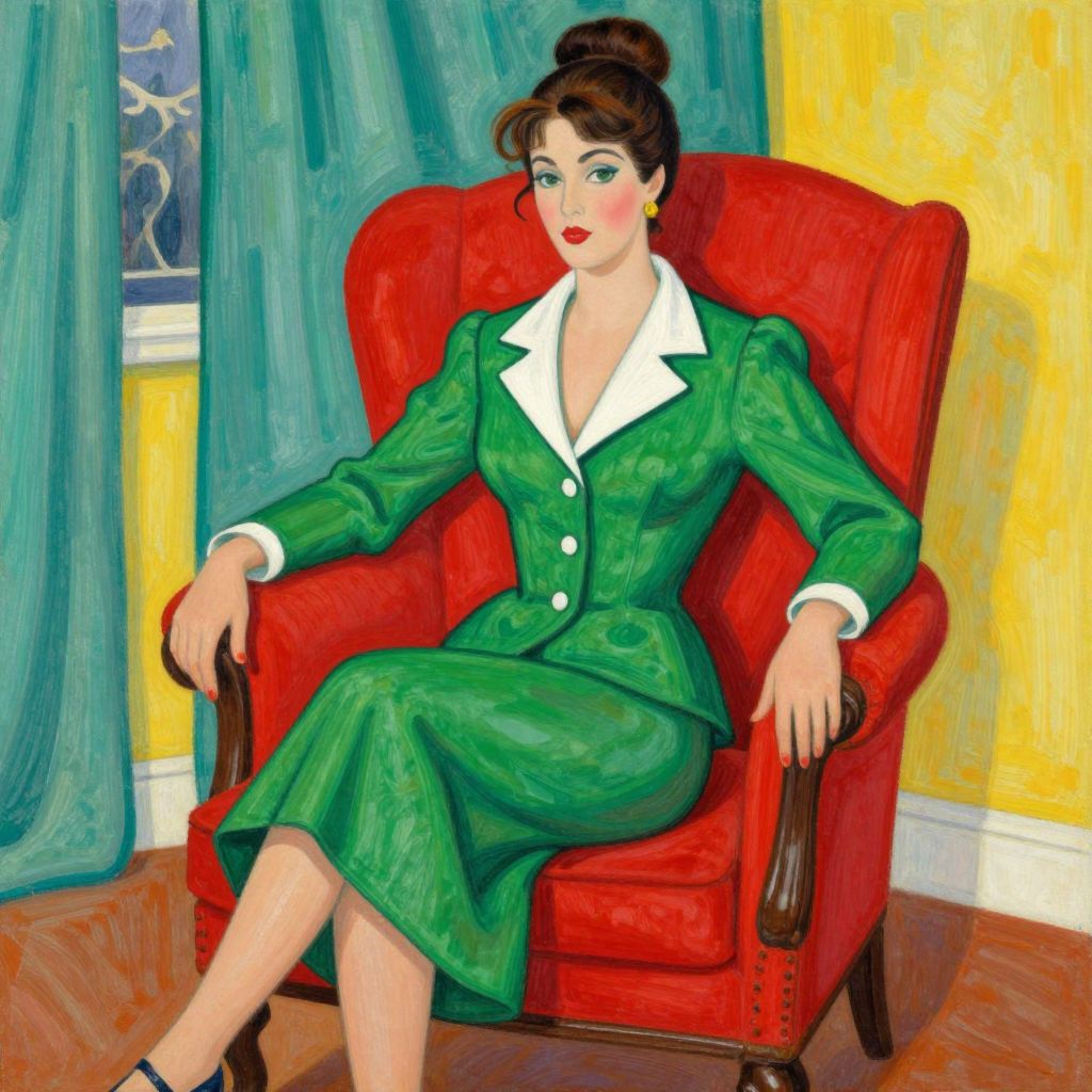 A vibrant illustration in the style of Andre Derain, featuring a woman elegantly seated in a red armchair, dressed in a classic green suit with white accents, set against a backdrop of teal curtains and warm yellow walls, showcasing a blend of retro charm and bold color contrasts.