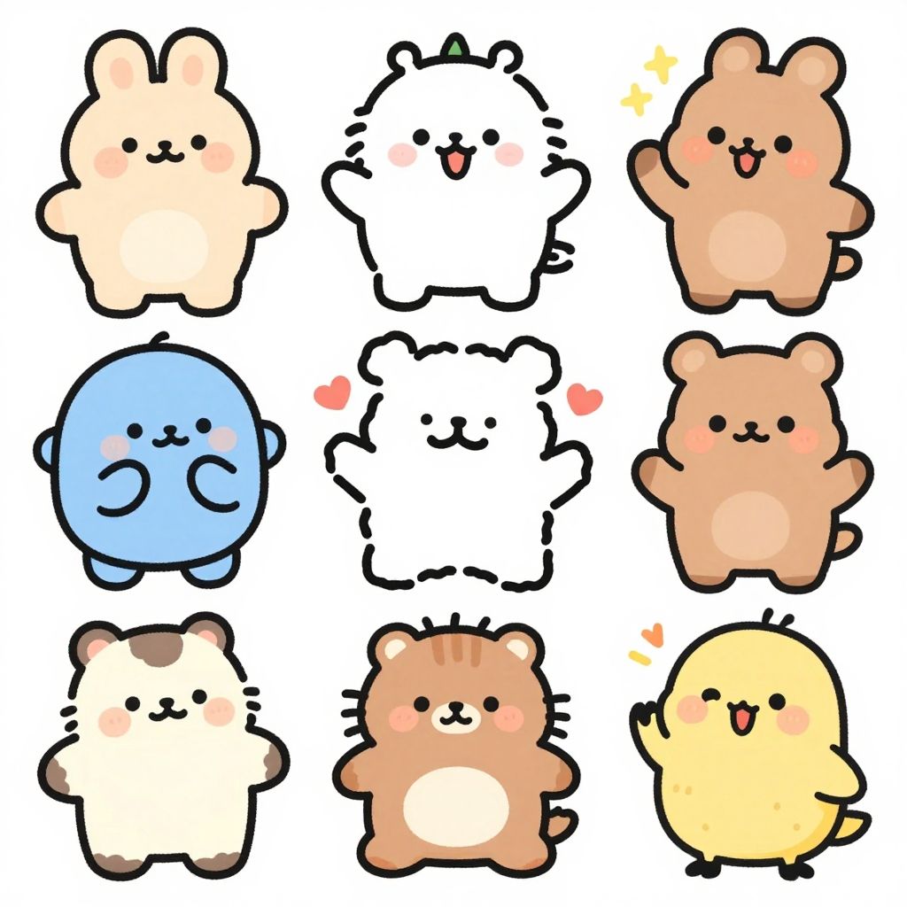 Cute cartoon styles blending classic hand-drawn elements with modern digital textures, featuring lovable creatures, lively poses, and colorful, detailed scenes