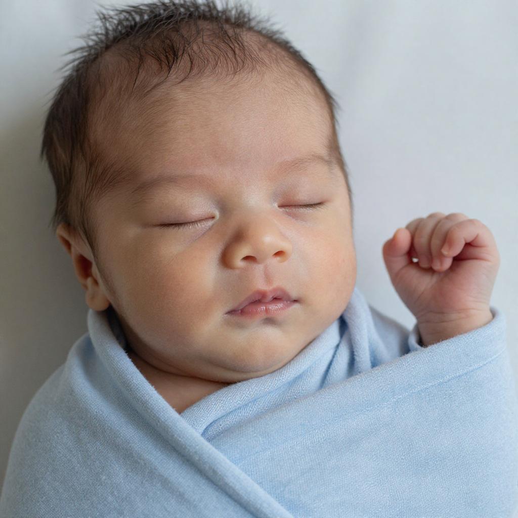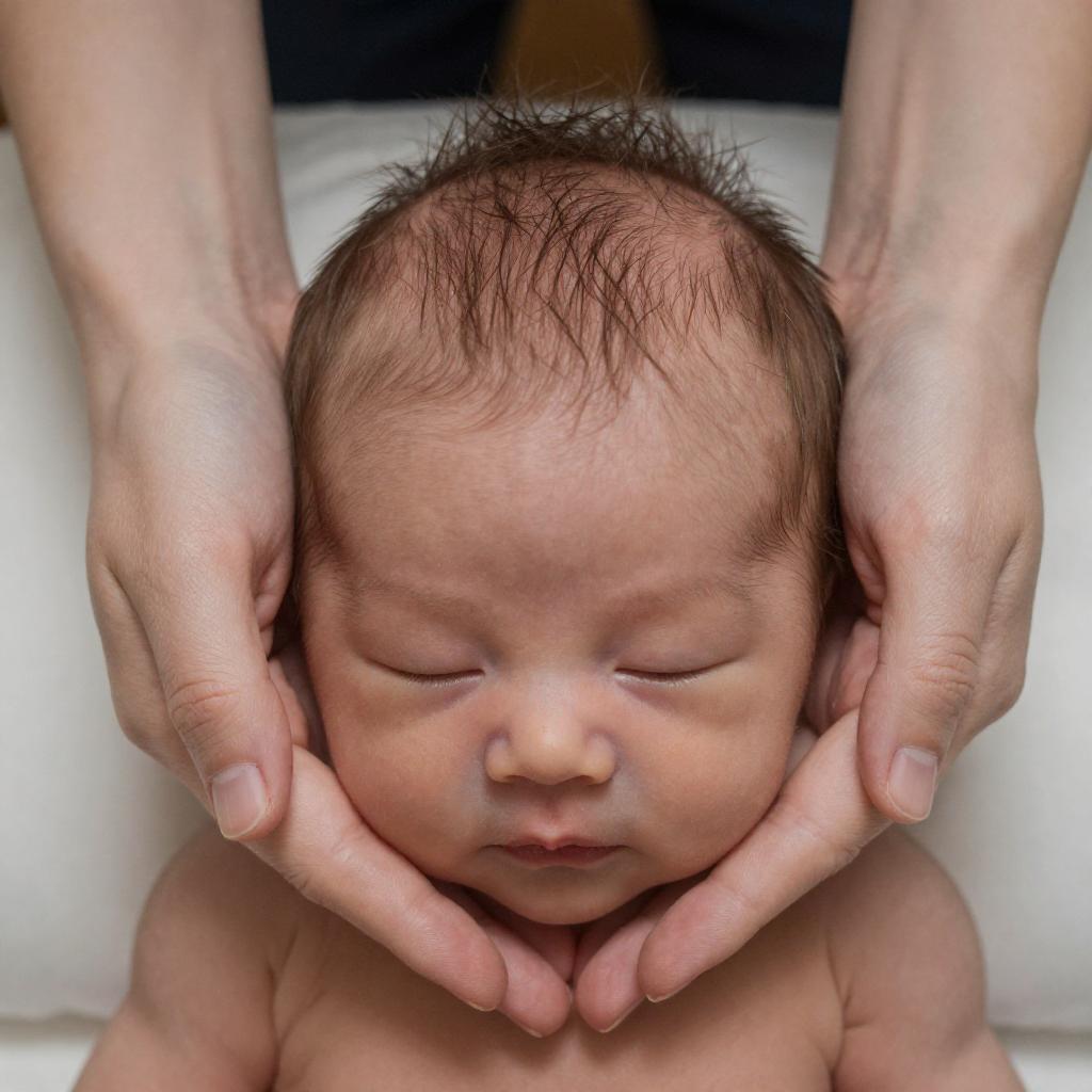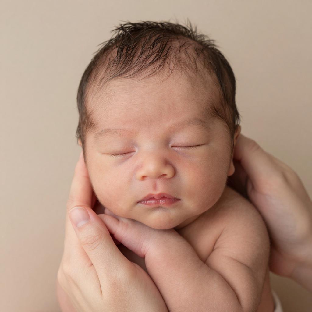Photograph of a newborn baby with closed eyes, soft pink lips, and dark, slightly messy hair. The baby's small arms are tucked under their chin. An adult's hands gently cradle the baby's head and back. The background is a plain, beige color and is blurred, keeping the focus on the baby and hands. The lighting is soft and even, highlighting the baby's delicate skin. The camera angle is close-up, capturing the baby's face and hands in detail. Depth of field is shallow, with a blurred background.