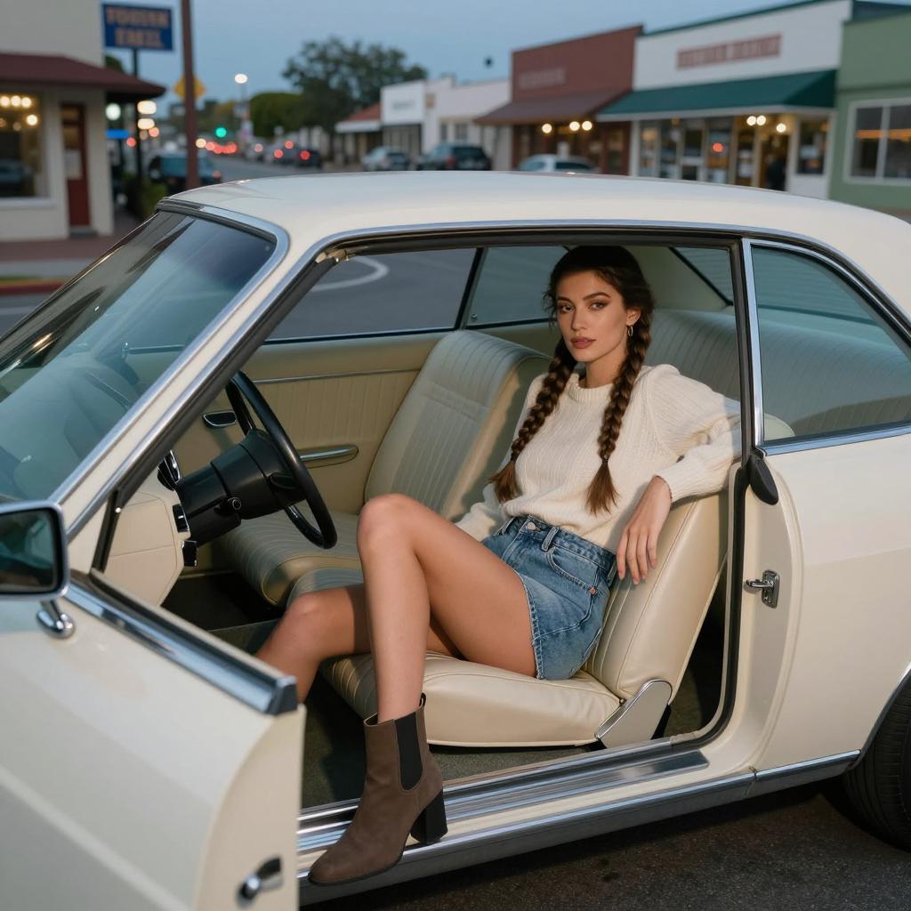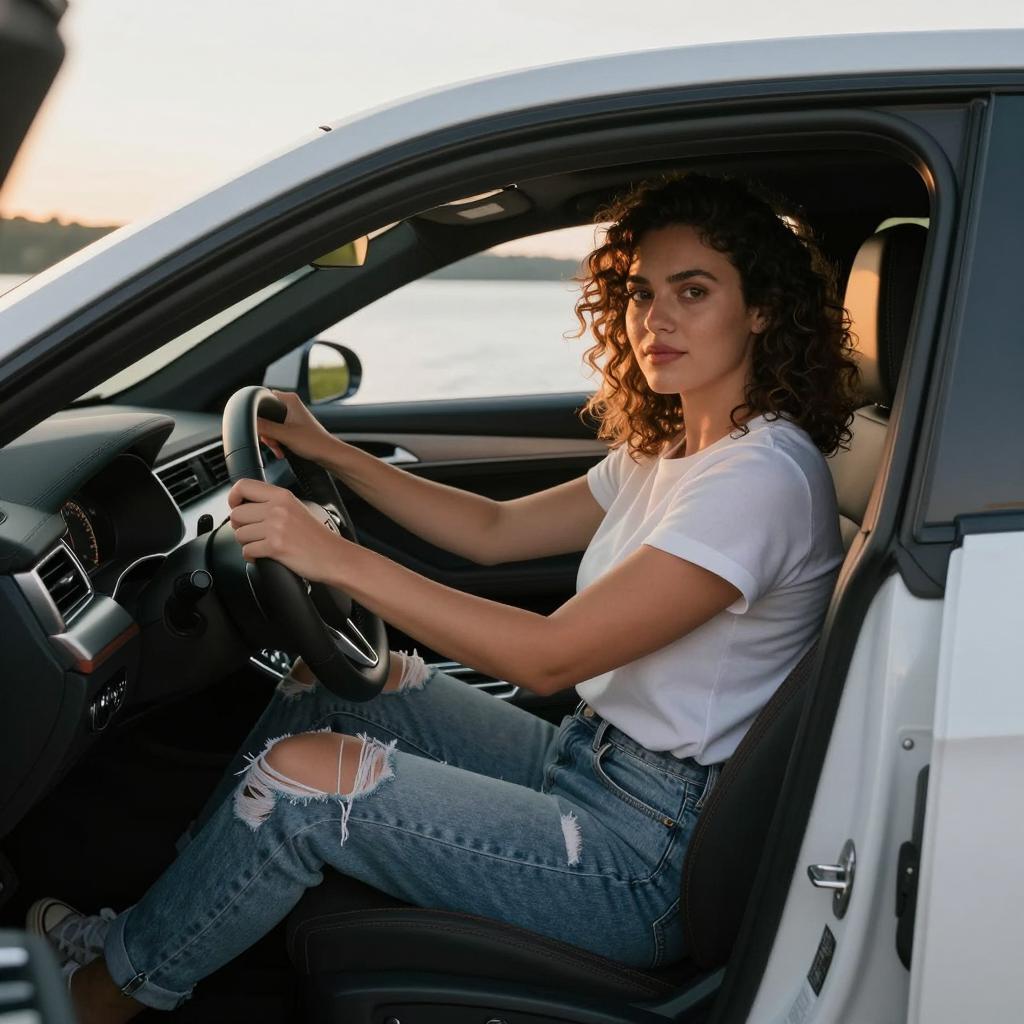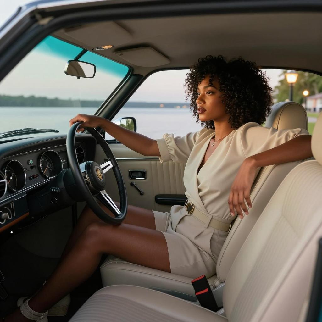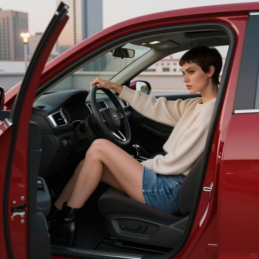 Woman in car, with electric performance car with futuristic LED dashboard, wearing sleeveless fitted top and short pencil skirt with classic high heels on petite woman with choppy bob and minimal makeup, perched on the door sill, one foot on the ground and one heel resting inside the car in parked by a lakeside with calm water and distant shore under cool blue-hour light with city lights beginning to sparkle from close-up from the door frame focusing on upper body and steering wheel, cinematic automotive lifestyle photography, high resolution, ultra-detailed