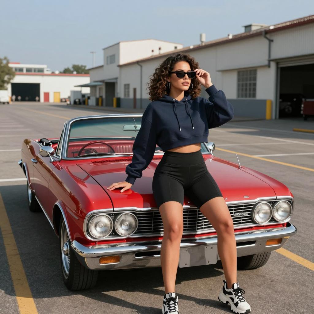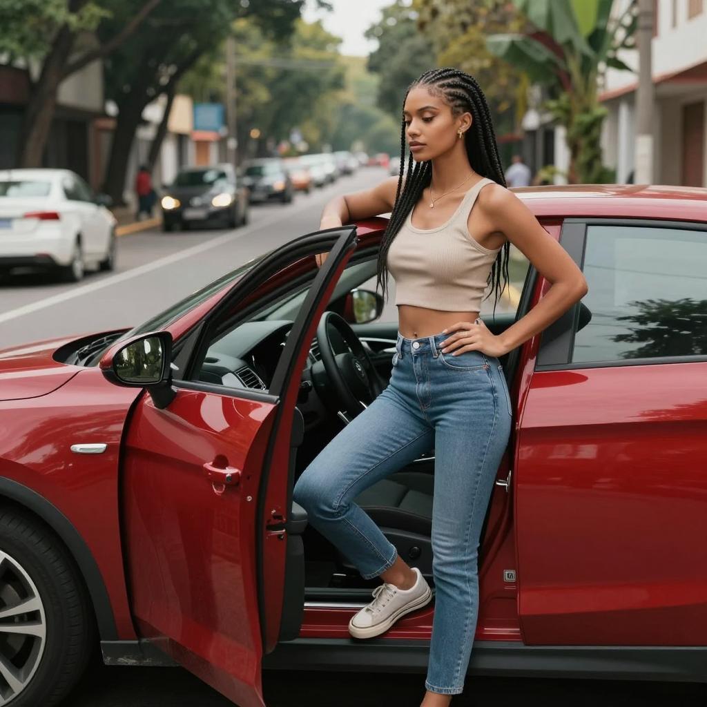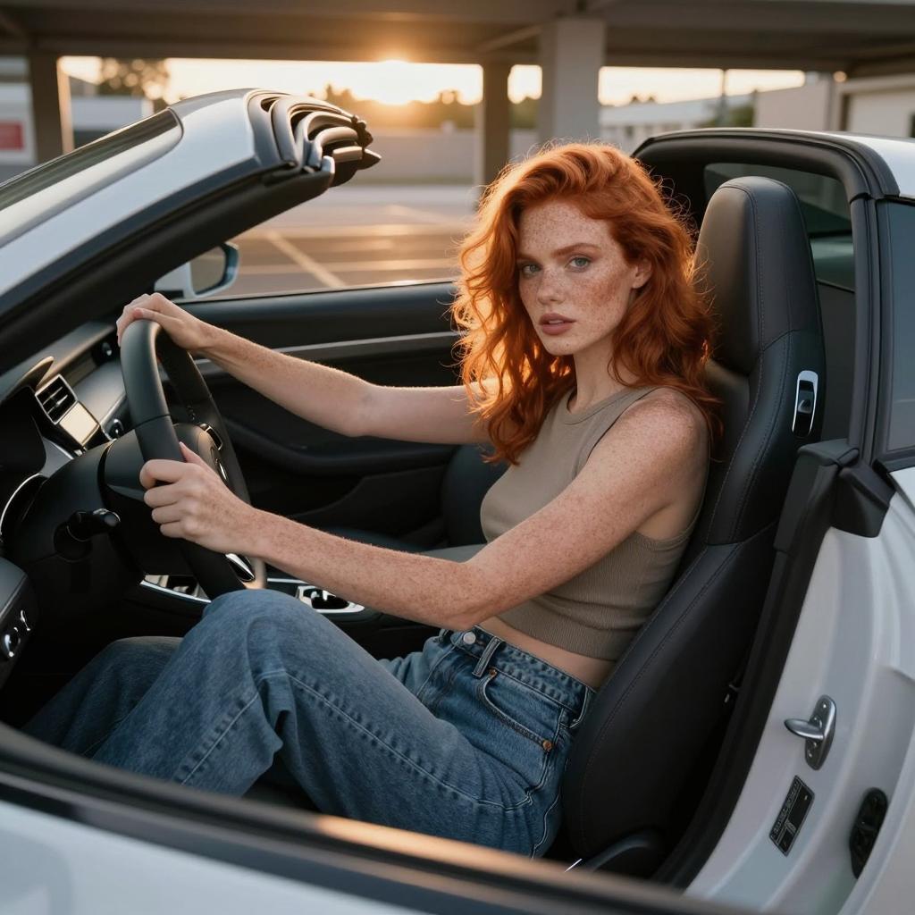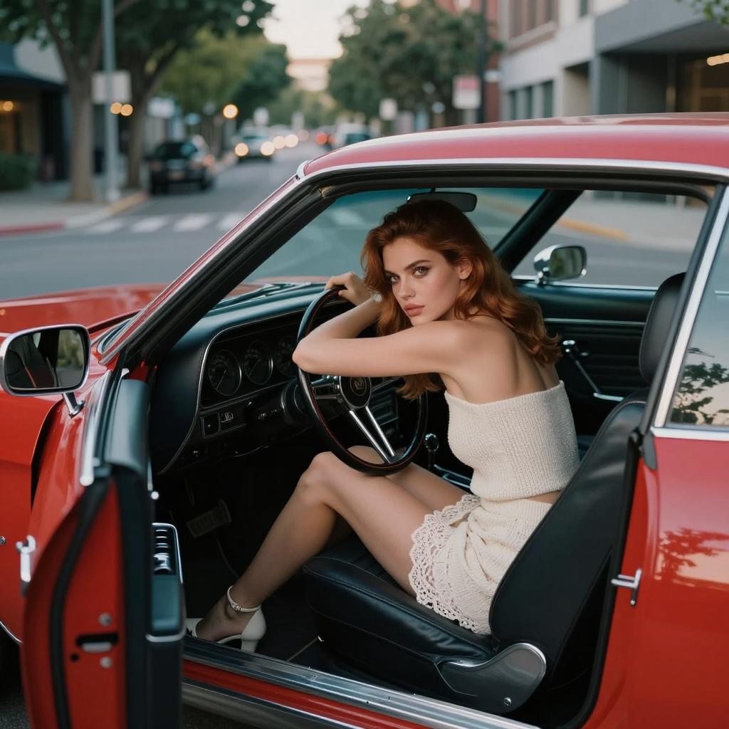 Woman in car, with electric performance car with futuristic LED dashboard, wearing sleeveless fitted top and short pencil skirt with classic high heels on petite woman with choppy bob and minimal makeup, perched on the door sill, one foot on the ground and one heel resting inside the car in parked by a lakeside with calm water and distant shore under cool blue-hour light with city lights beginning to sparkle from close-up from the door frame focusing on upper body and steering wheel, cinematic automotive lifestyle photography, high resolution, ultra-detailed