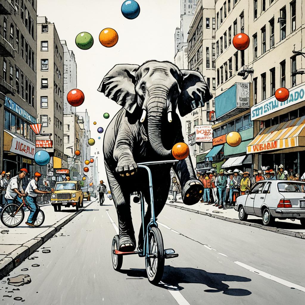 A single-panel ink and wash cartoon in the style of Mad Magazine, depicting an elephant riding a unicycle while juggling colorful balls on a busy city street, whimsical and humorous tone, highly detailed