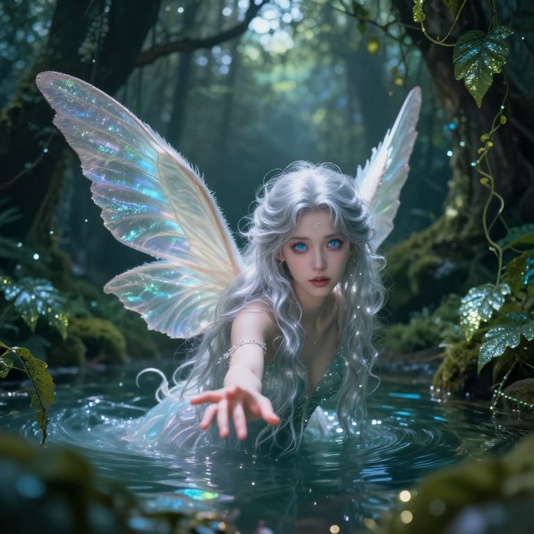 An entrancing digital art composition evokes the whimsical essence of a mystical forest, with an enchanting creature emerging from a shimmering pool. The scene is captured through an ethereal lens, showcasing the delicate interplay of light and shadow on the creature's iridescent wings and luminous, silvery hair. Her captivating sapphire eyes seem to hold ancient secrets as she extends a hand towards the viewer, inviting them into her mesmerizing realm. Glimmering leaves and shimmering vines sustain the captivating illusion throughout the lush surroundings, evoking wonder and reverence for this magical encounter.