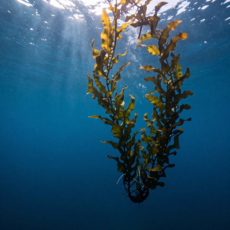 Photograph of underwater scene featuring a cluster of yellow and brown seaweed floating in deep blue water. Sunlight penetrates from above, casting bright rays and creating a shimmering effect on the seaweed's surfaces. The seaweed has wavy, leaf-like structures and a dark, tangled base. The background is a gradient of dark to lighter blue, highlighting the depth and clarity of the water. The overall image has a serene, natural beauty and captures the tranquil atmosphere of an underwater environment.