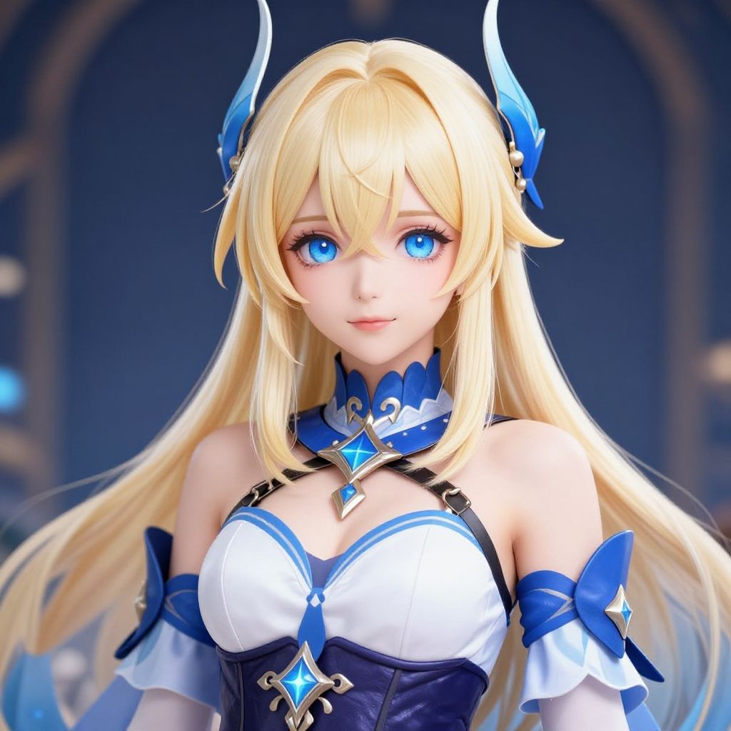 A digitally illustrated anime-style woman with long blonde hair and striking blue eyes gazes directly at the viewer. She is dressed in a detailed fantasy-inspired outfit with blue and white hues, adorned with star-shaped accessories and a revealing neckline, showcasing a blend of modern and magical girl aesthetics.