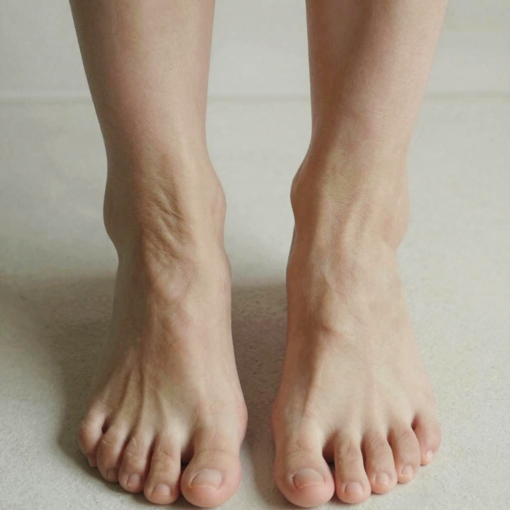 Veiny female feet in close-up, showcasing detailed skin texture and prominent veins, soft natural lighting emphasizing anatomical realism, high resolution, artistic style blending photorealism with subtle painterly touches, neutral background.
