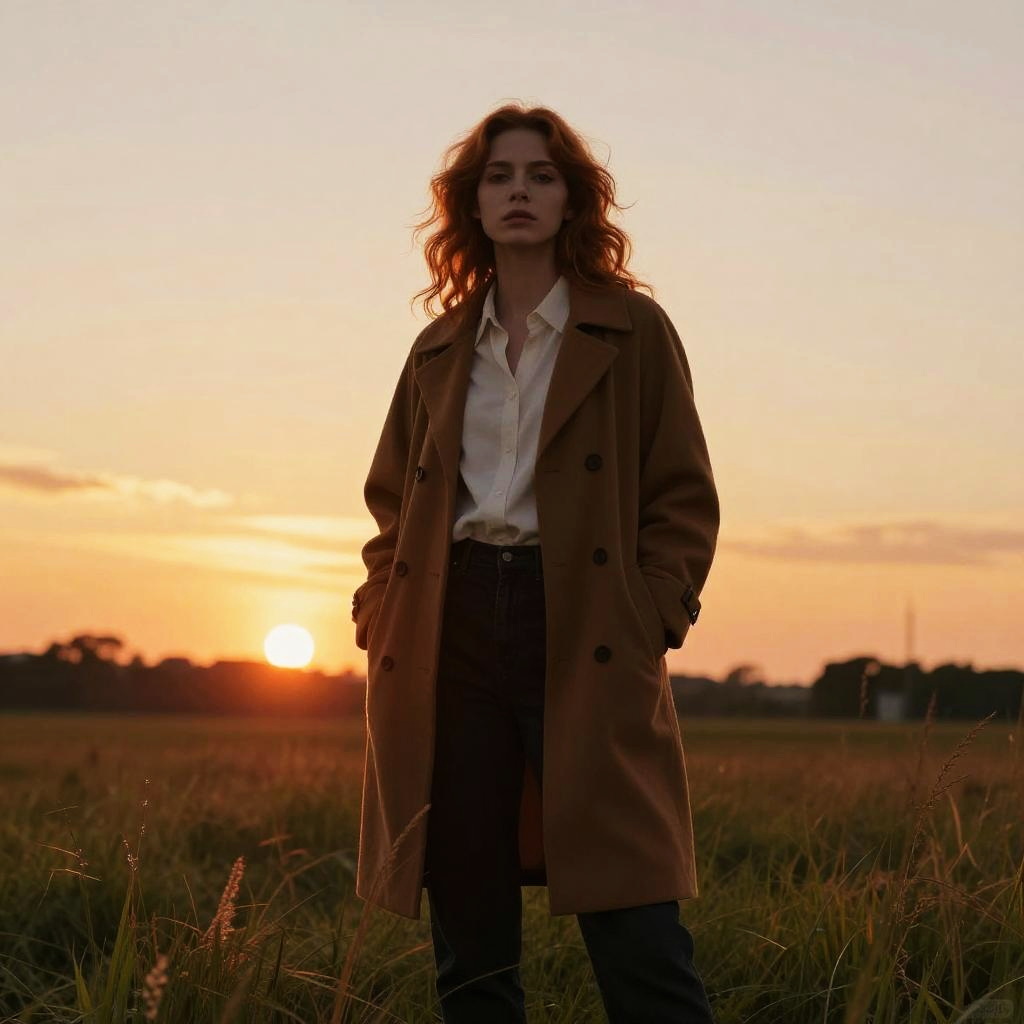 Photograph of a young woman with wavy, red-brown hair standing in a grassy field during sunset. She's wearing a brown coat over a white shirt and dark pants, with a serious expression. The sun is low on the horizon, casting a warm orange and yellow glow across the sky and grass. Her silhouette is backlit, creating a dramatic effect. The watermark is in the bottom right corner.
