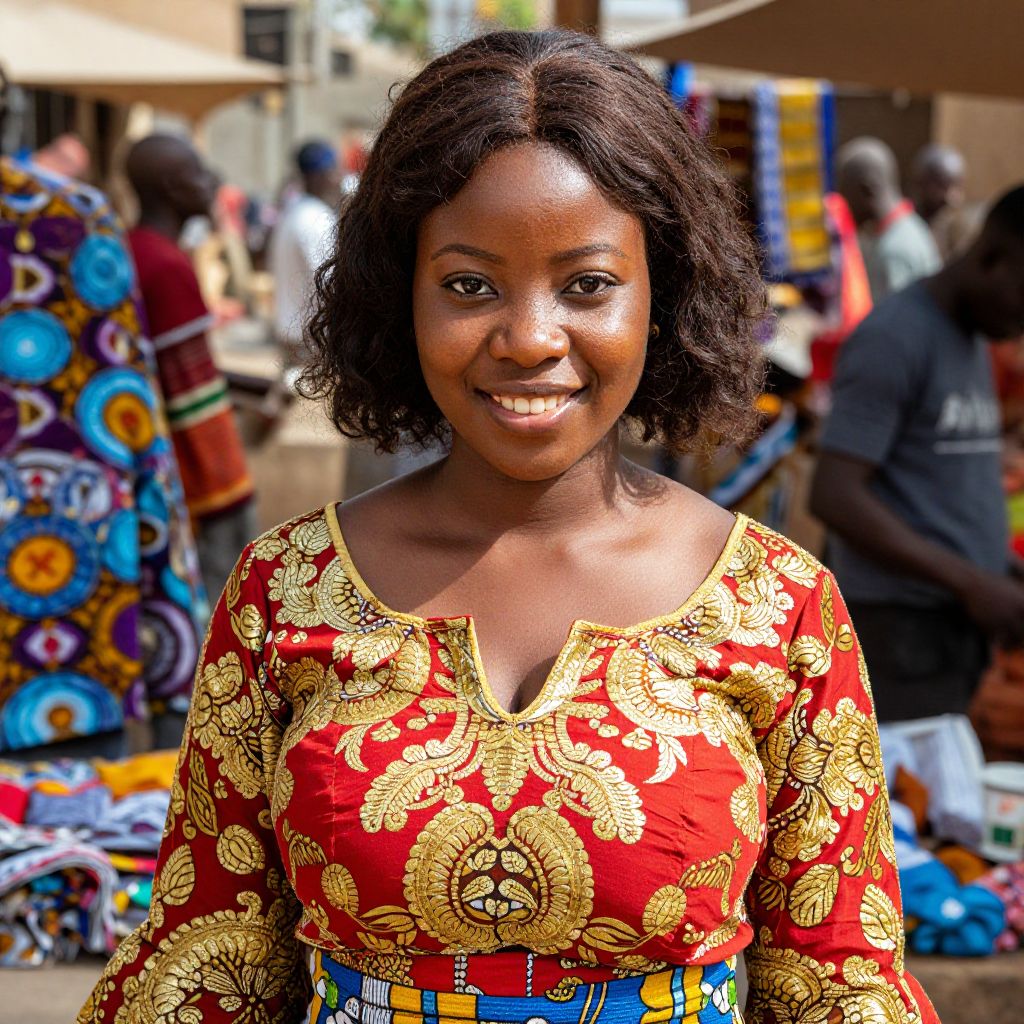 A young African woman with a short curly bob haircut and warm brown skin, wearing a vibrant red and gold Nigerian traditional costume, standing in a sunny market square with colorful fabrics and handmade crafts around her, natural sunlight casting soft shadows on her face with a bright smile and deep brown eyes.. The woman has big tits and cute face