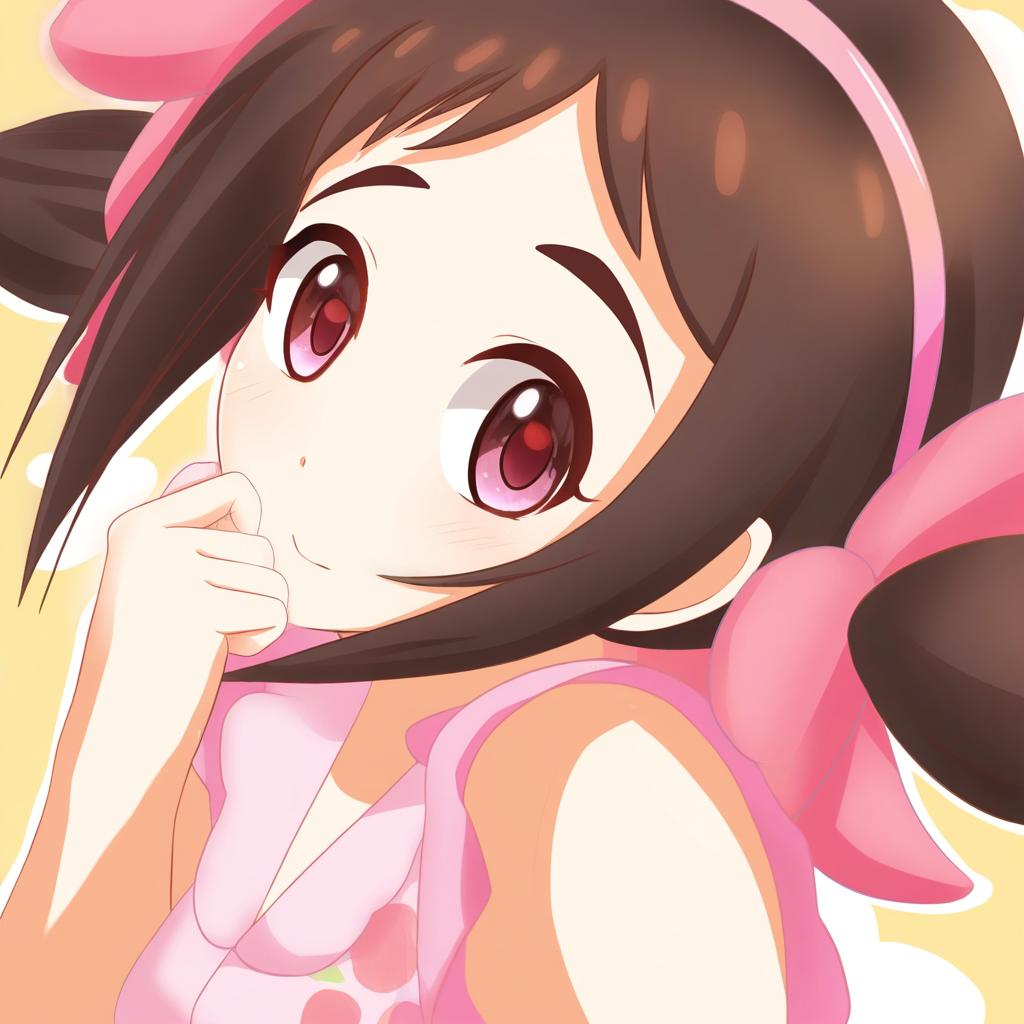 Digital anime-style drawing of a young girl with large, expressive pink eyes and dark brown hair, adorned with a pink headband and a matching pink bow. She has fair skin and is wearing a pink and white sleeveless top. Her right hand is gently touching her lips in a shy, contemplative gesture. The background is a soft gradient of yellow and white, enhancing the pastel colors of her outfit and accessories. The image has a vibrant, cute, and playful aesthetic.