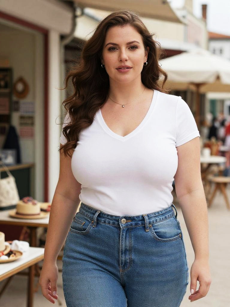 A Curvy woman, in a casual contemporary style with a black cropped tank top and houndstooth trousers, stands at a street market book stall, captured in the vibrant visual style of Pedro Campos. Sexy. Pretty face and beаutiful eyes. Big breasts