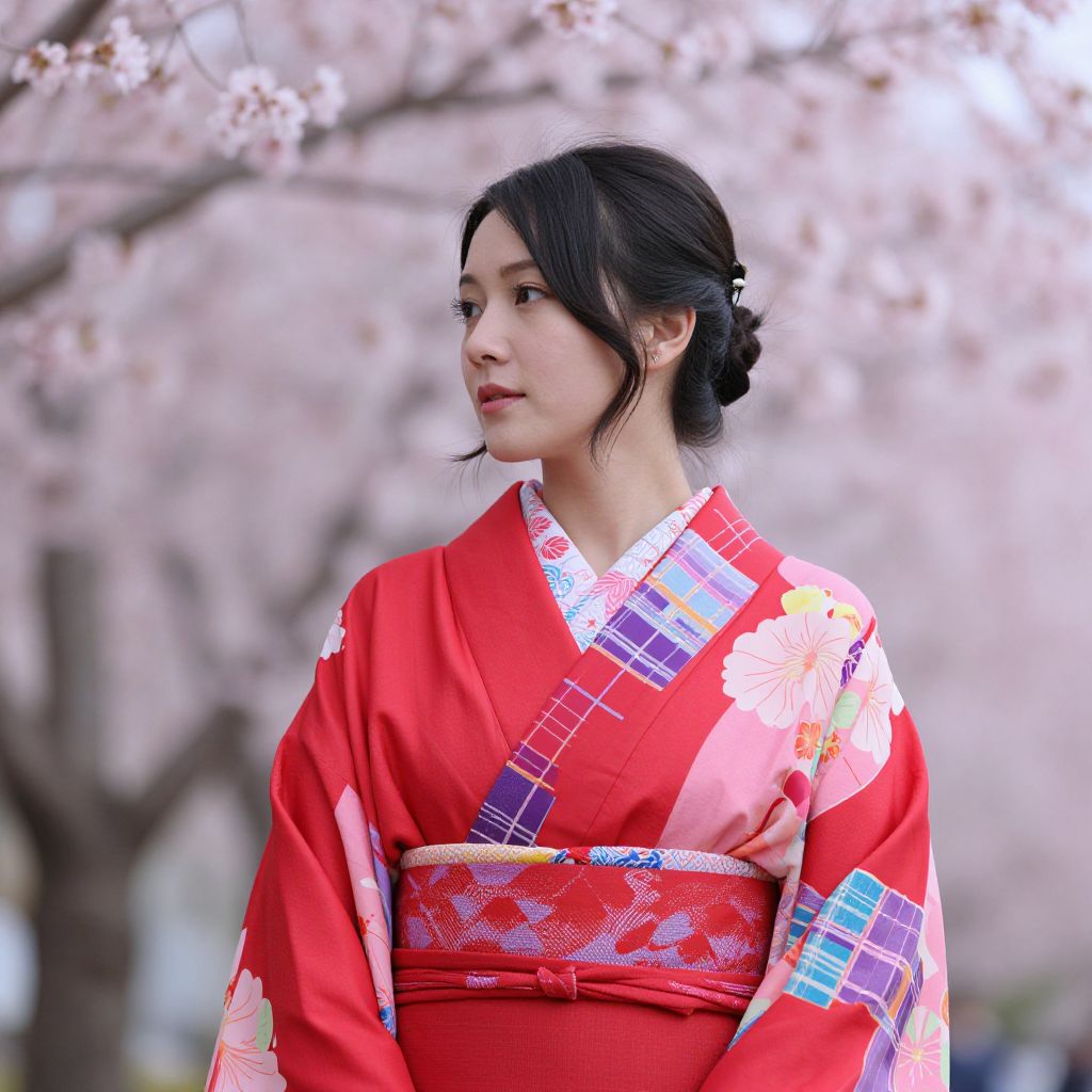 Woman gazing toward the left, adorned in a vibrant red and pink patterned kimono featuring purple and blue plaid trim, complemented by a red undergarment with a blue patterned collar, set against a backdrop of cascading pink cherry blossoms.
