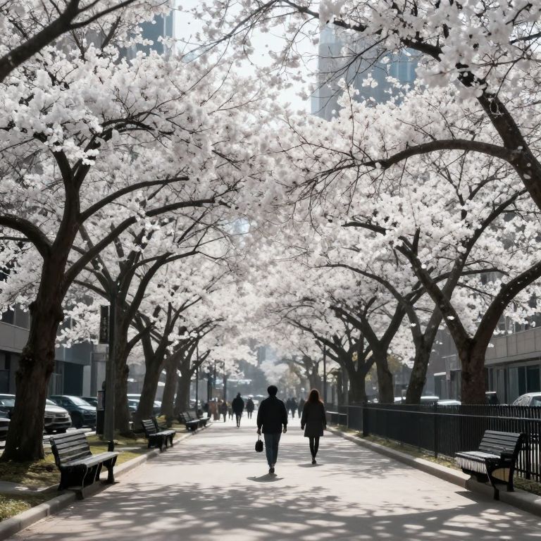 Photograph of a sunlit, tree-lined urban path during cherry blossom season. Silhouetted figures of people walk down the center, with more distant figures in the background. The trees are densely covered in white cherry blossoms, creating a canopy of light. Sunlight filters through, casting dappled shadows on the path. Benches line both sides of the path, and modern buildings are visible in the background. The overall scene is bright, airy, and serene, capturing the beauty of spring in an urban park setting.